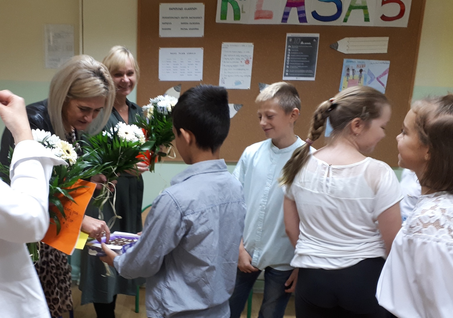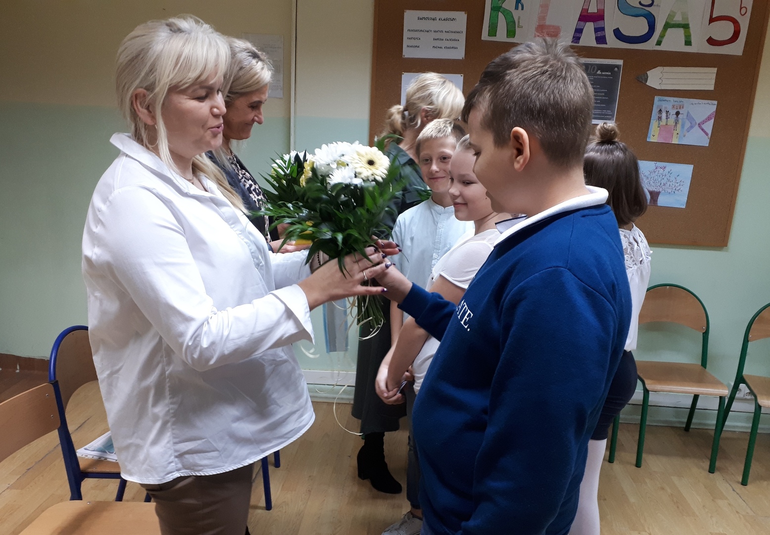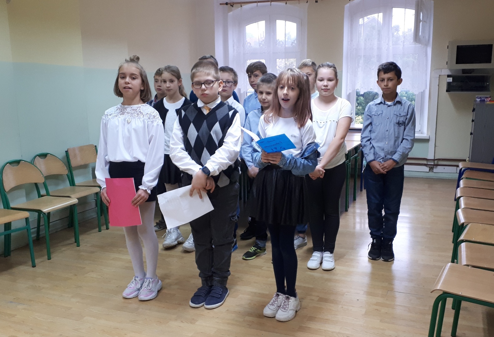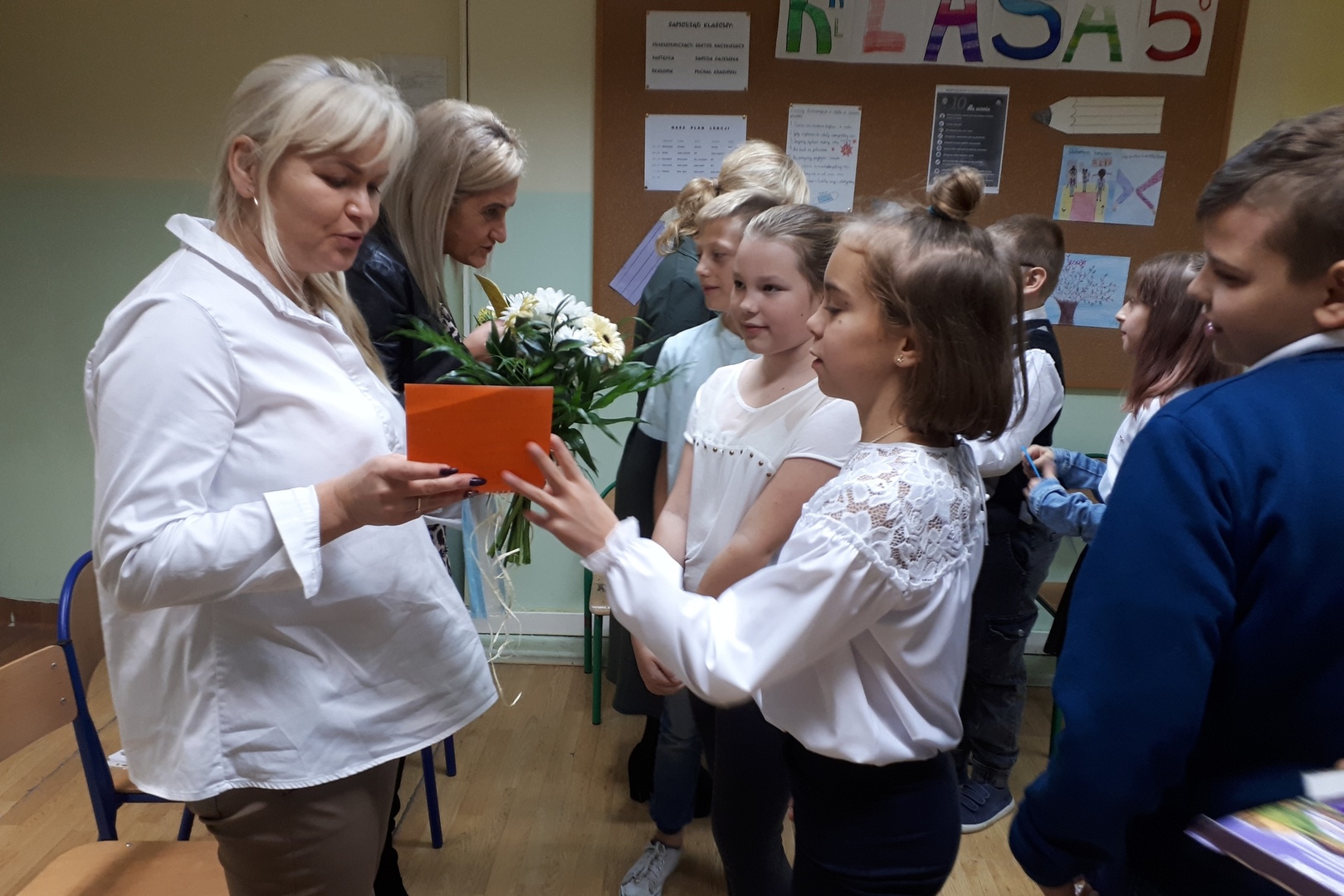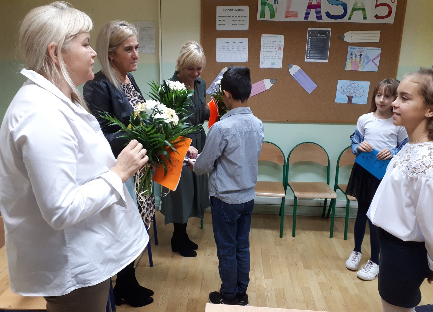 Z okazji Dnia Nauczyciela klasa 5 b przygotowała dla wszystkich nauczycieli krótki program artystyczny. Niestety, z powodu ograniczeń (jesteśmy od soboty w żółtej strefie), na widowni mogły zasiąść tylko trzy osoby. Były to, jak się słusznie się domyślacie, pani dyrektor i obie panie wicedyrektor. Dla wszystkich nauczycieli, klasa 5 b przygotowała jednak nagranie ze wspomnianym występem. Dodajmy, bardzo ciepło przyjętym przez wszystkich oglądających. Poniżej prezentujemy kilka zdjęć z uroczystości.