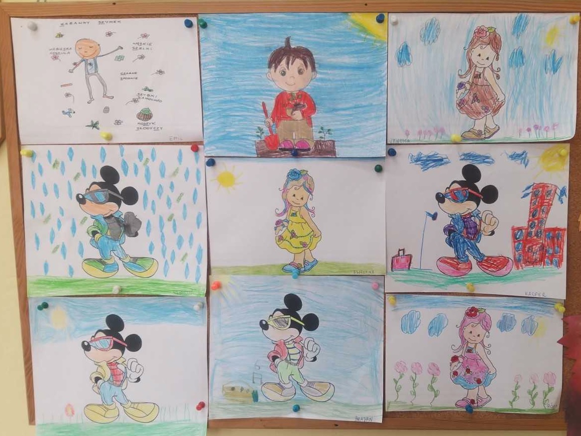 W klasie 1a dzieci kolorowały nie tylko szelki w spodenkach chłopców, ale także cały czas modne u dziewczynek spódniczki „blue jeans” na szelkach.