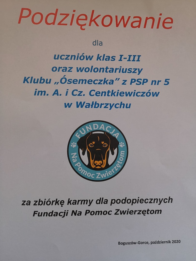 Podziękowania dla uczniów klas I-III oraz wolontariuszy Klubu Ósemeczka za zbiórkę karmy dla podopiecznych Fundacji Na Pomoc Zwierzętom.