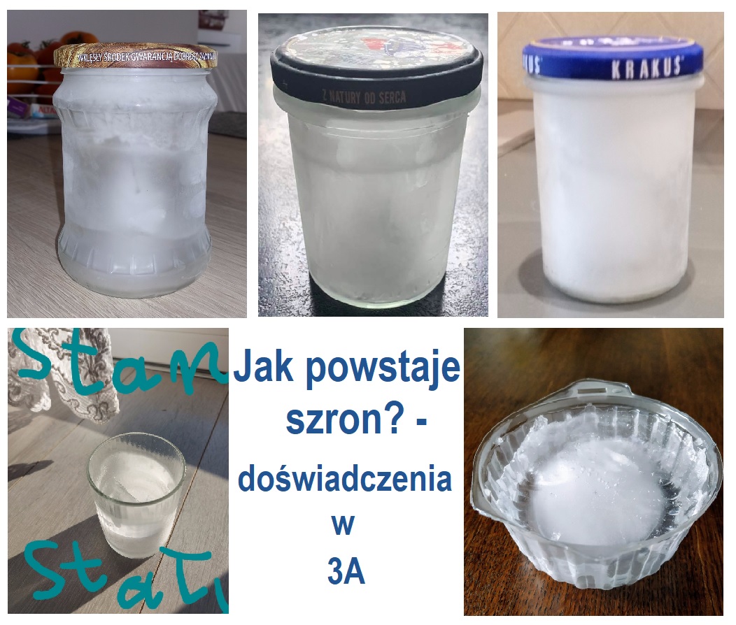 W ramach zajęć dodatkowych, rozwijających zdolności matematyczno – przyrodnicze – dzieci klas trzecich miały możliwość m.in. poznania przyczyny powstawania szronu. Własnoręcznie przeprowadziły w domu doświadczenie wstawiając słoik z wodą do zamrażarki. Po wyjęciu słoika z zamrożoną wodą na własne oczy widziały jak wilgoć osiada na szklanych ściankach i zamarza tworząc szron.