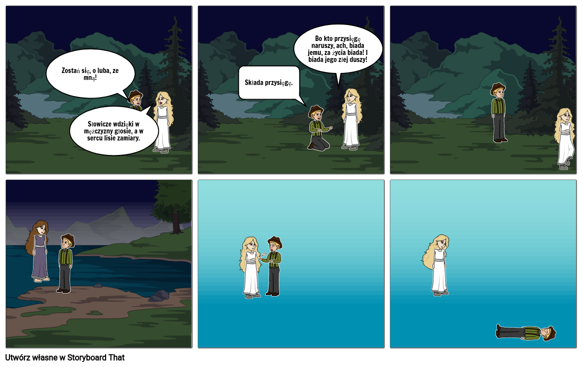 Na kolejnych lekcjach języka polskiego uczniowie z klasy 7e próbowali „oswoić” obowiązkowe teksty Adama Mickiewicza. Wykorzystując nowoczesne narzędzia pracy, odtworzyli w programie storyboard historię pokazaną w balladzie „Świtezianka”. Powstały piękne komiksy.