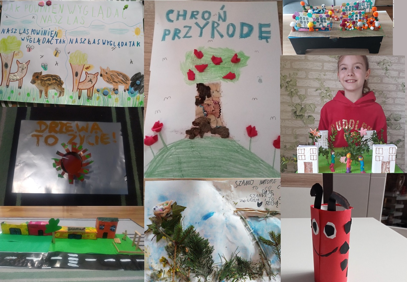 Tematy prac: „Makieta zielonego osiedla”, plakat: „Chrońmy lasy”, zabawki z materiałów wtórnych.