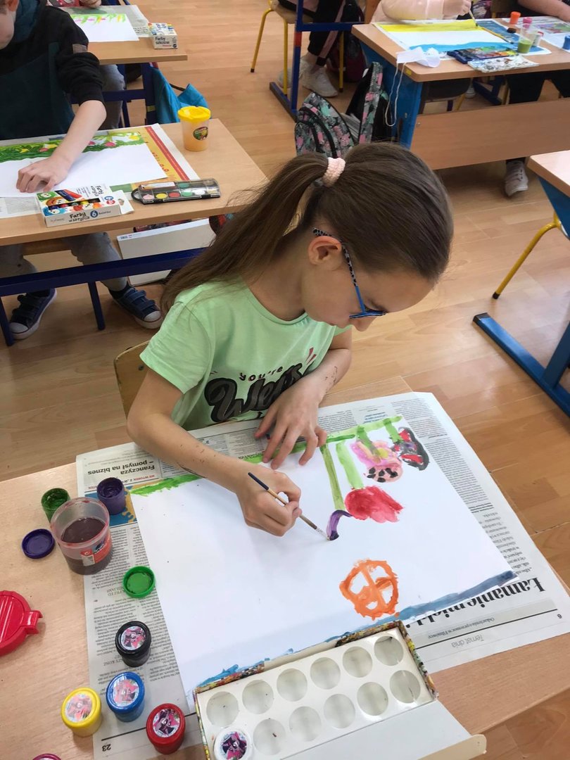 Praca z farbami, kredkami, plasteliną i innymi akcesoriami plastycznymi jest niezbędna do prawidłowego, wszechstronnego i harmonijnego rozwoju dziecka. Uczniowie klasy 3c chętnie biorą udział w zabawach plastycznych, samodzielnie tworzą i eksperymentują. Pozwalają wyzwalać drzemiącą w dzieciach aktywność twórczą. A tak w pełnym skupieniu malowali majową łąkę oraz lepili z plasteliny bohaterkę naszej lektury czyli tytułową Karolcię.