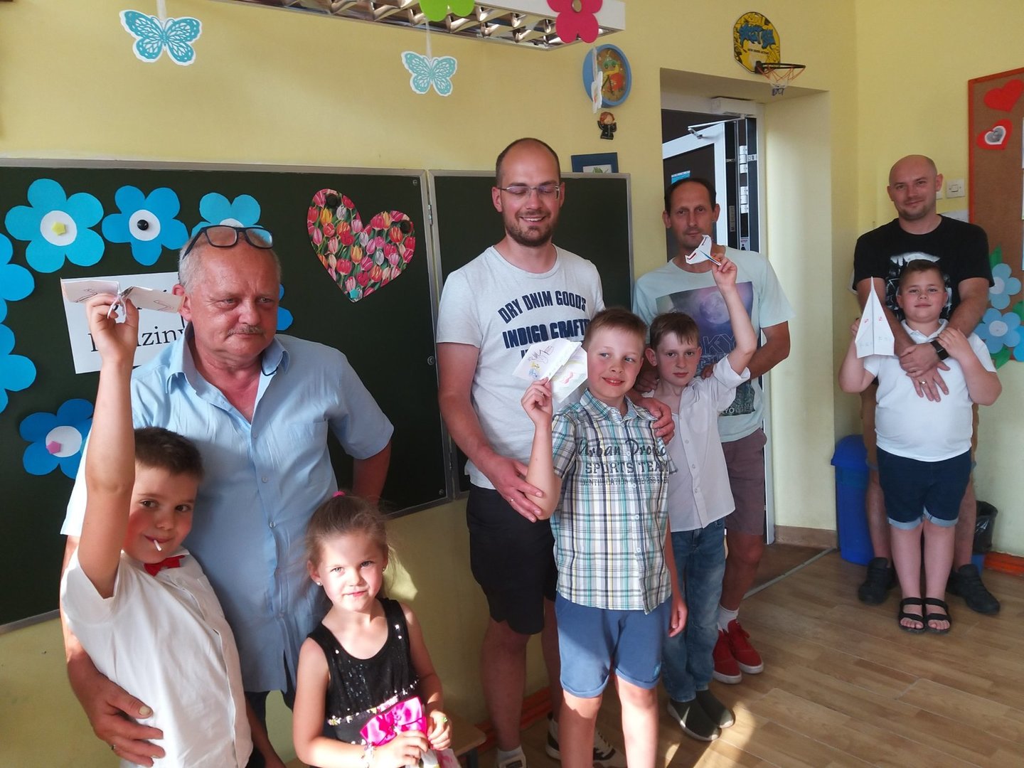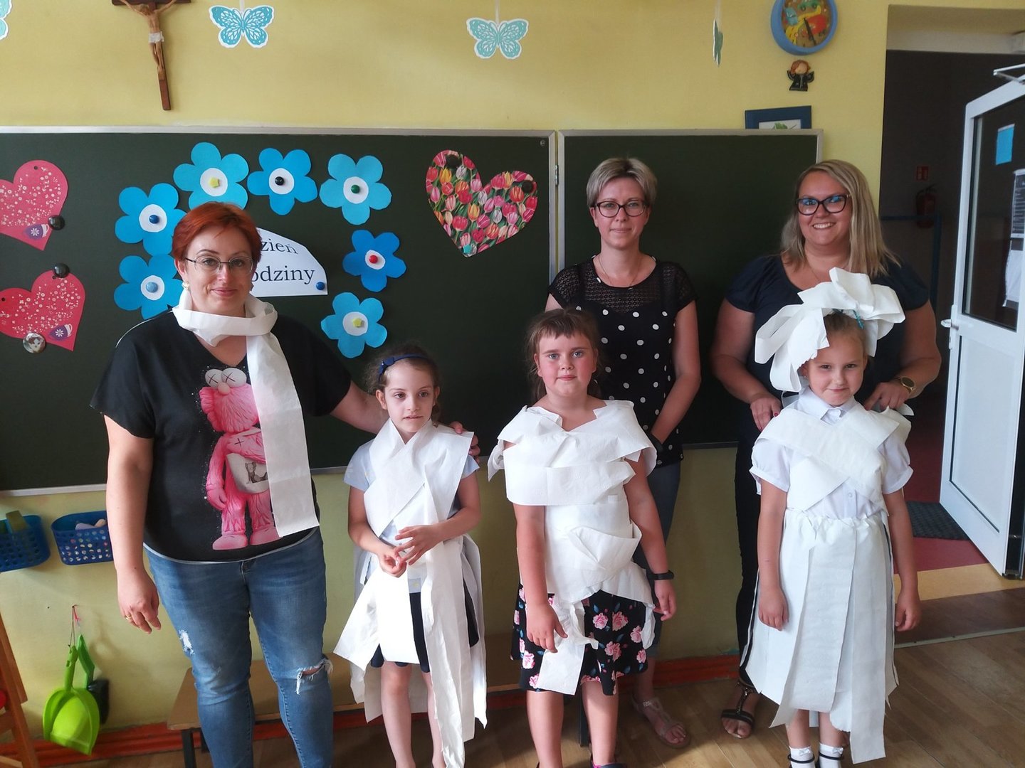 Po obejrzeniu programu artystycznego, który podobał się naszym gościom (burzliwe oklaski), zaczęła się część druga- konkursy. Mamusie miały za zadanie wykonać kreację dla swojej córki z papieru toaletowego. Tatusiowie natomiast razem ze swoimi synami składali i ozdabiali samoloty z papieru. Był też konkurs pt."Gdzie jest nasza rodzina?", czyli odgadywanie portretu swojej rodzinki.