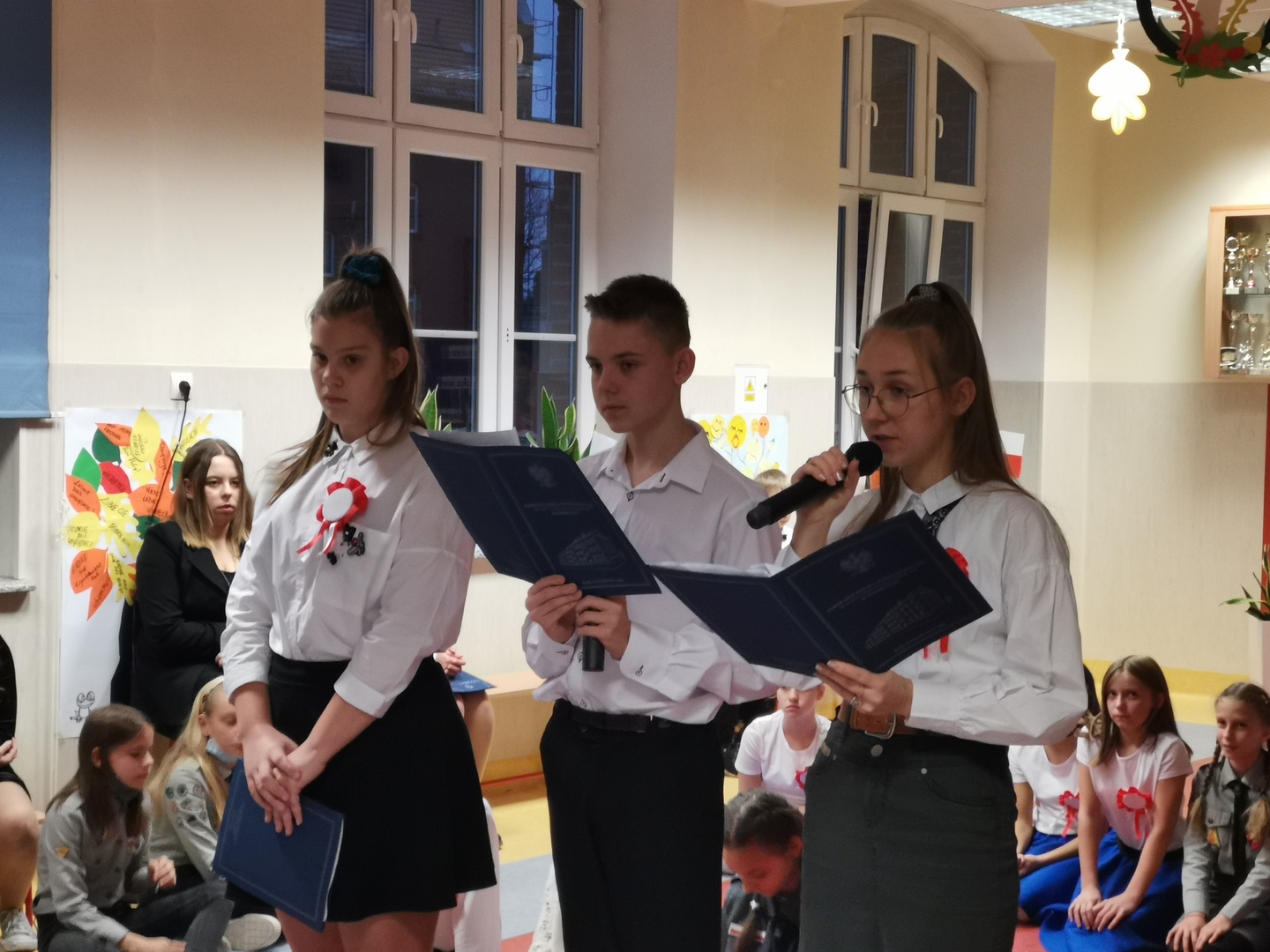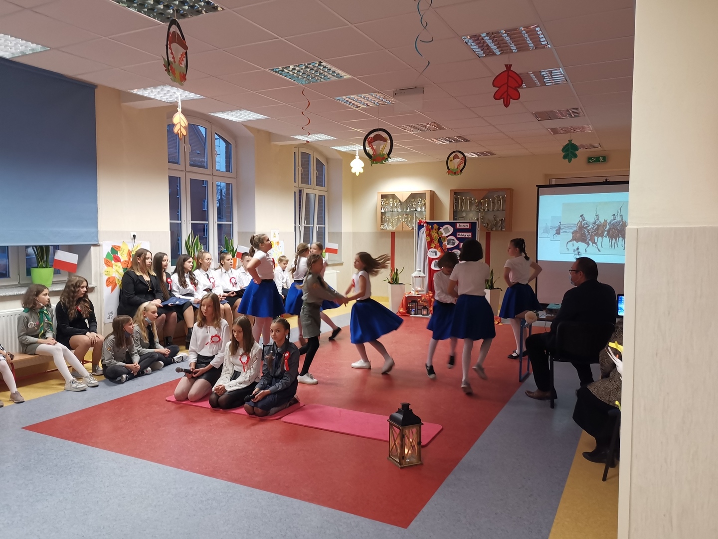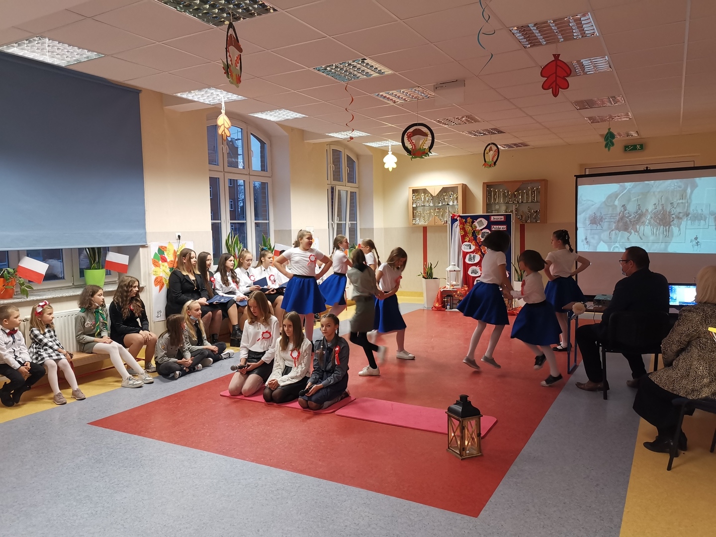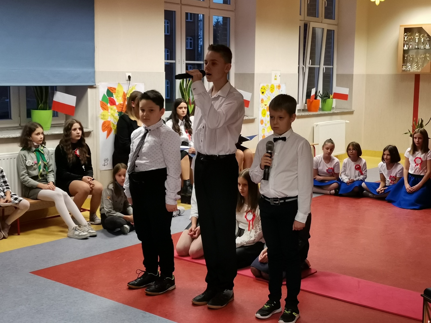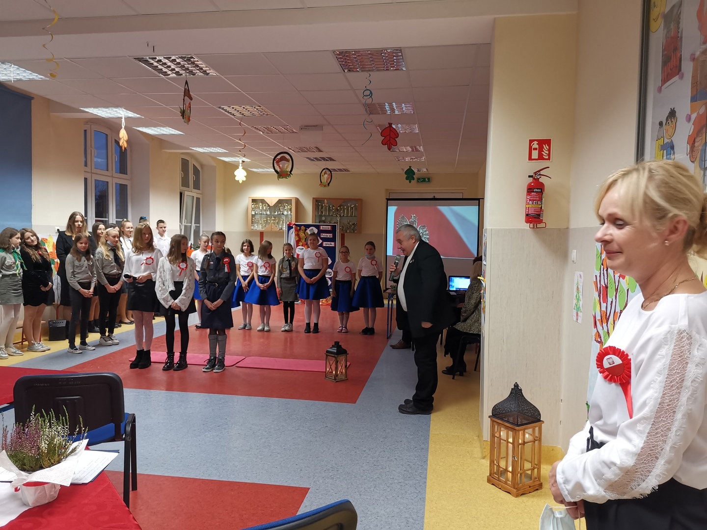 Uczniowie naszej szkoły zaprezentowali przybyłym gościom wzruszający i wartościowy montaż słowno-muzyczny, na który złożyły się: część artystyczna z prelekcją historyczną, wspólne śpiewanie pieśni patriotycznych oraz recytacje wierszy.