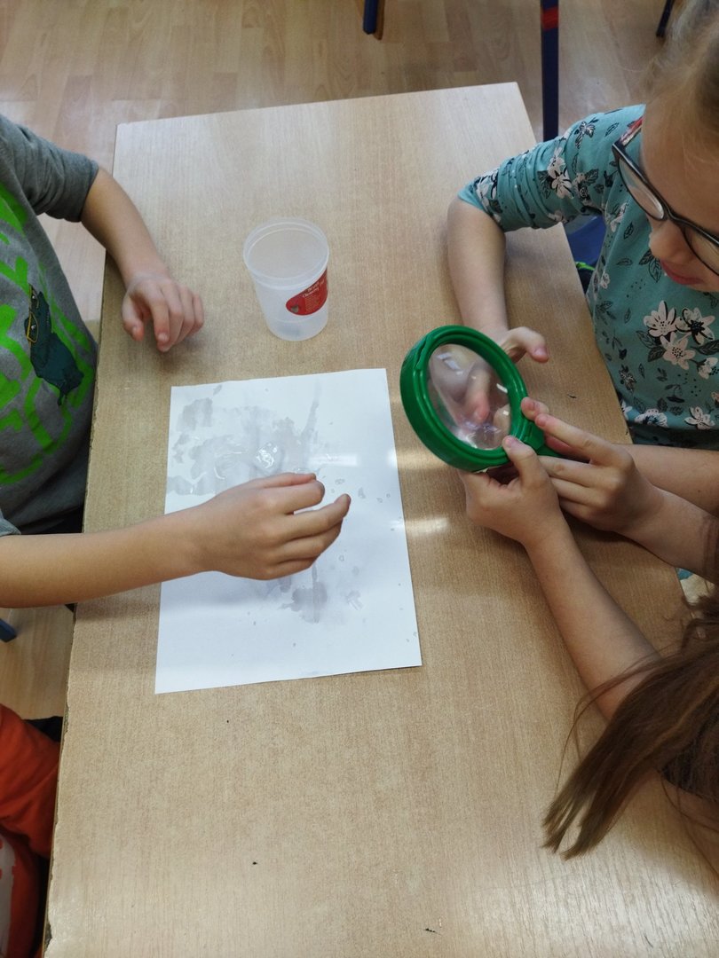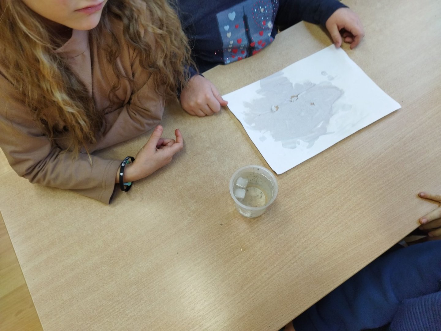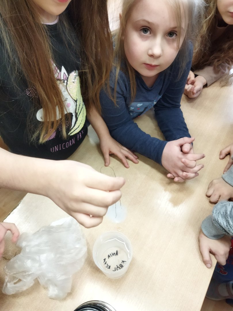 Natomiast 17 stycznia 2022 r. klasa 1 a zamieniła się w małe laboratorium przyrodnicze. Uczniowie za pomocą doświadczeń poznali właściwości lodu. Dowiedzieli się, że lód jest twardy, zimny, przezroczysty, kruchy oraz że jest lżejszy od wody. Dzieci zaobserwowały, że lód zanurzony w pojemniku z woda i posypany solą kuchenną stopił się, a nitka położona na kostce lodu zamarzła.