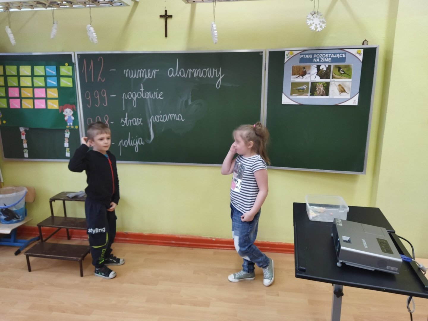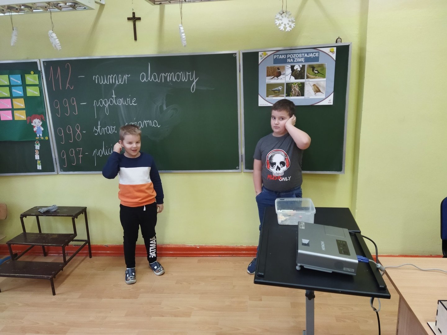 13 stycznia 2022 r. uczniowie klasy 1 a poznali na lekcji numery alarmowe. Wstępem do lekcji było kodowanie na macie. Uczniowie obejrzeli film edukacyjny „Warto wiedzieć, sytuacje alarmowe”. Dowiedzieli się jak skorzystać z numeru alarmowego 112 w razie niebezpieczeństwa oraz w jakich sytuacjach należy wezwać odpowiednie służby. Odgrywając scenki dramowe nauczyli się, jakie informacje należy podać przez telefon w razie zagrożenia dzwoniąc na numer alarmowy.