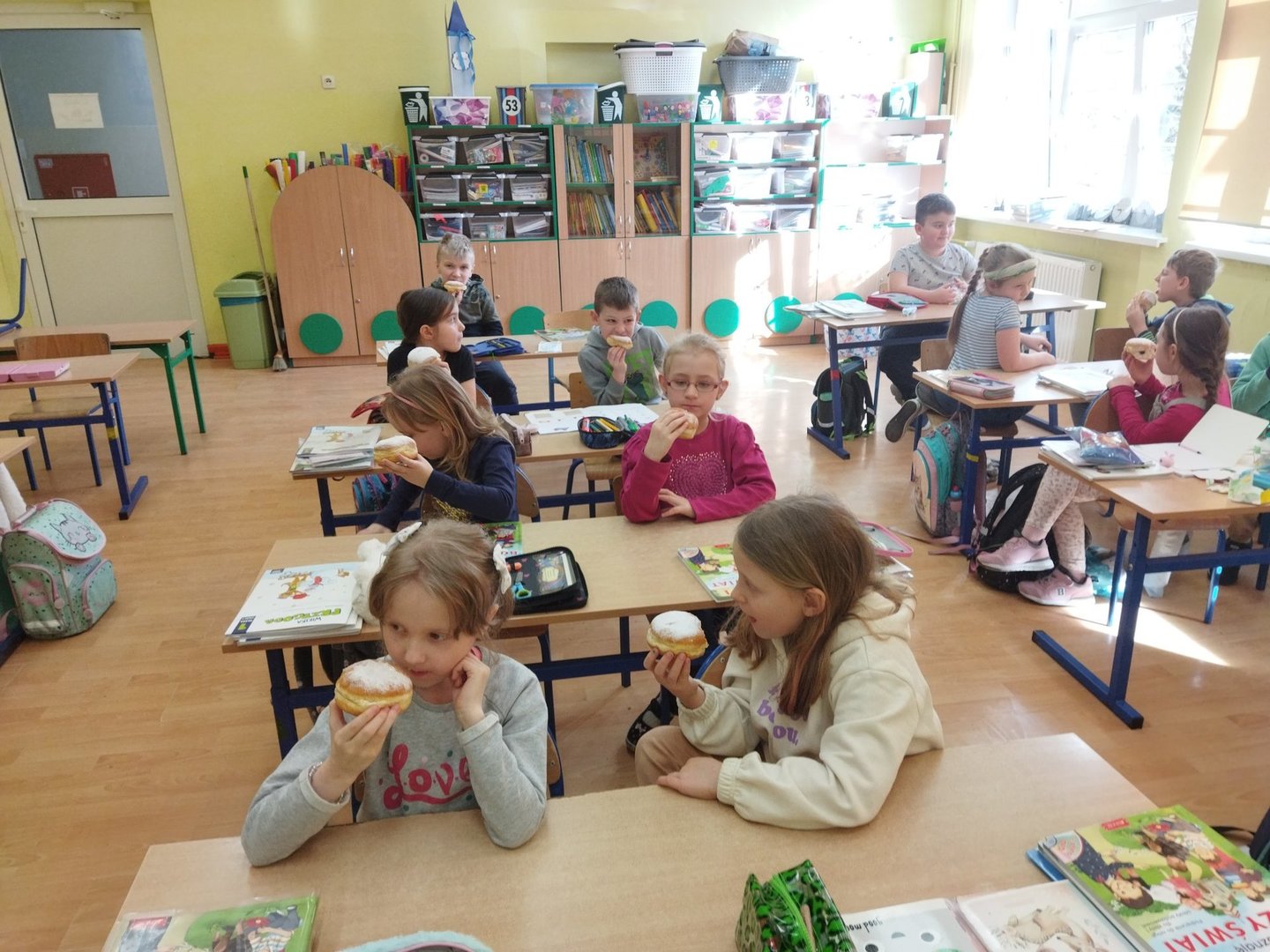 Dnia 24 lutego uczniowie klasy 1 wraz z wychowawcą - jak głosi tradycja również zajadali się słodkimi pączkami. Dziękujemy trójce klasowej za przygotowanie dla nas tak pysznych paczków.