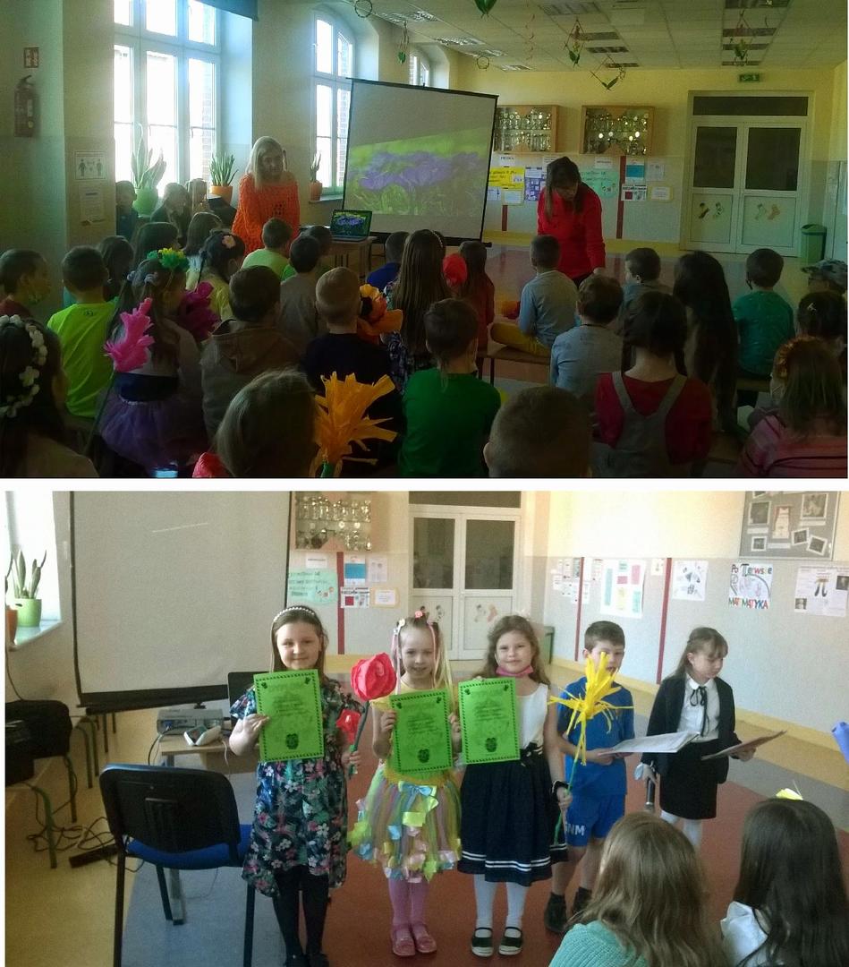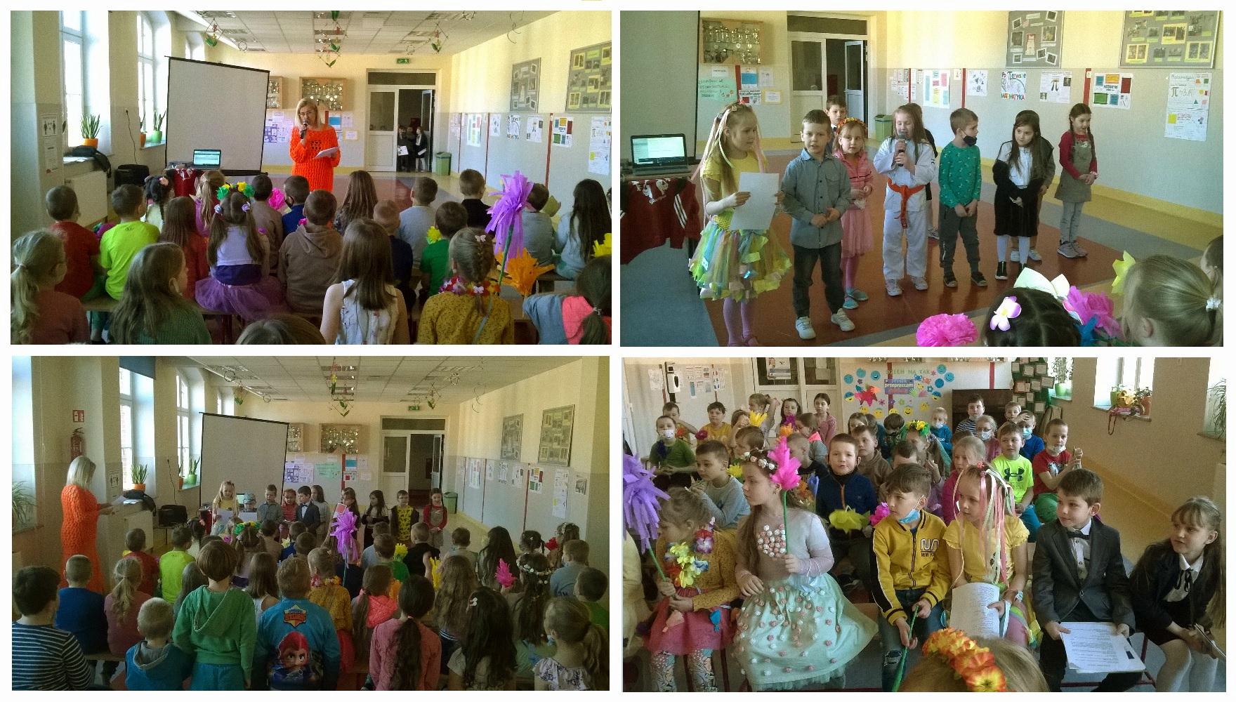 W dniu 21 marca nadeszła do nas pełna życia, oczekiwana pora roku zwana Wiosną. Dla klas pierwszych pani Arletta Lenkiewicz w ramach „Kultury na co dzień” przygotowała na ten dzień występ swoich uczniów połączony z konkursem wiedzy na temat wiosny, rozpoznawaniem ptaków i kwiatów wiosennych oraz prezentacją wiosennych strojów przez pierwszaków. Dzieci obejrzały prezentację , aby potem zdobytą wiedzę wykorzystać w czasie konkursu wiedzy o wiośnie. Oczywiście na koniec za udział w konkursach, klasy otrzymały dyplomy. I tak klasy pierwsze powitały tą pełną nadziei, radosną porę roku.