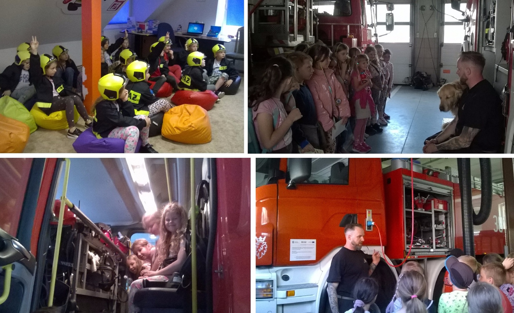 Potem, na umówioną godzinę udały się do Posterunku Straży Pożarnej. Tam dowiedziały się ciekawostek na temat pracy strażaków. Przebrały się w stroje strażackie, obejrzały filmy pokazujące jak szybko może wybuchnąć pożar np. na choince – drzewko stanęło w płomieniach już po 7 sekundach od awarii instalacji choinkowej! Dzieci poznały również zasady zachowania bezpieczeństwa w razie pożaru oraz co mówią nam znaki związane z pożogą. Wchodziły do wozu strażackiego, widziały „Bestię” czyli wielki wóz bojowy o pojemności wody 8 ton. Zwiedzającym towarzyszył pies strażacki imieniem Orion. Na koniec każde z nich mogło wejść i chwilę posiedzieć w strażackim kadzie. Być może w niejednym z dzieci została zaszczepiona chęć do pracowania w zawodzie strażaka czego im życzymy.