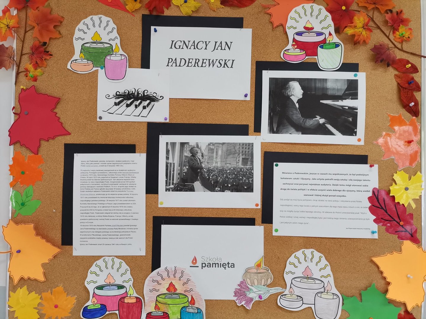 Klasa 4b przygotowała gazetkę ścienną poświęconą pamięci Ignacego Jana Paderewskiego: podwójnego, jak o nim mówiono, bohatera: sztuki i ojczyzny. Kompozytora, który podjął się również misji bycia politykiem, działając na rzecz pokoju i odzyskania przez Polskę niepodległości.
