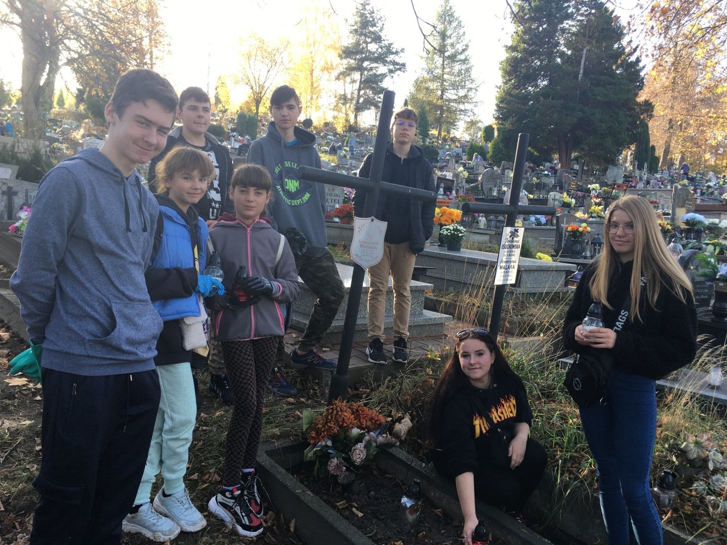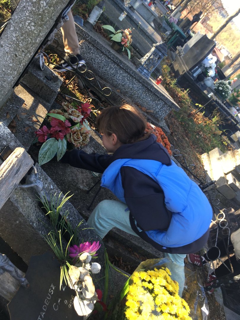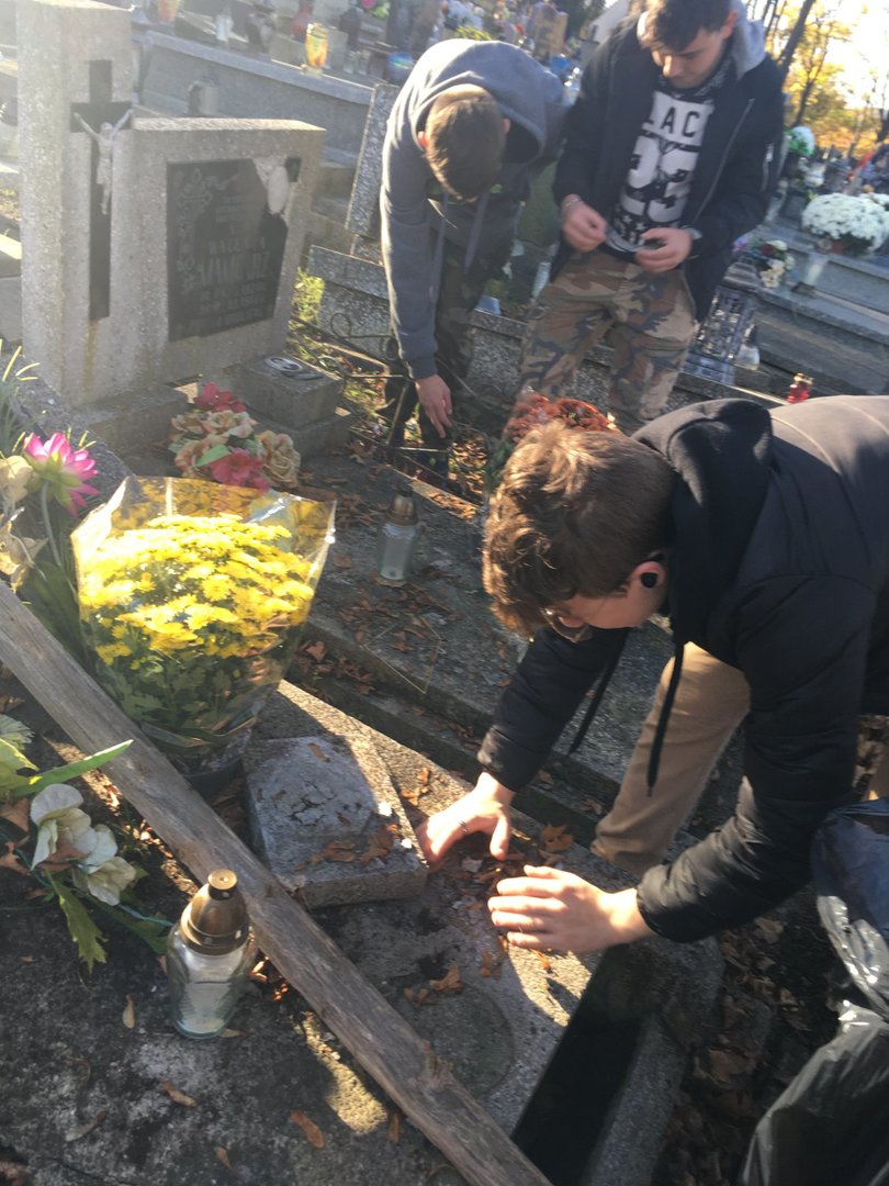 31 października, mimo dnia wolnego od szkoły, wolontariusze Szkolnego Klubu Ósemeczka udali się na parafialny cmentarz, aby uporządkować zaniedbane i opuszczone groby. To czas spędzony nie tylko na porządkach, ale towarzyszyła temu pamięć o zmarłych nauczycielach i uczniach naszej szkoły, rozmowa o przemijaniu, modlitwa za dusze zmarłych i zapalenie pamiątkowych zniczy.