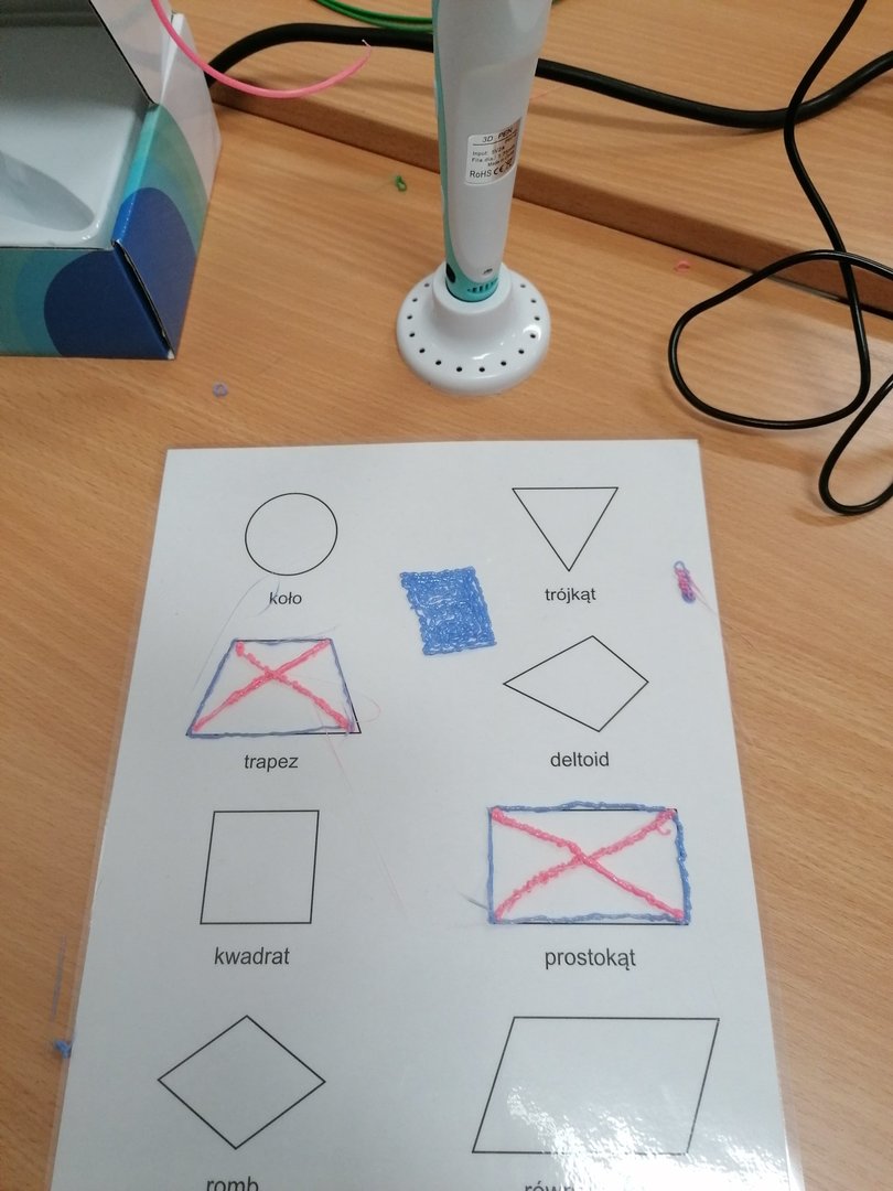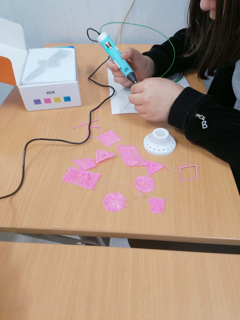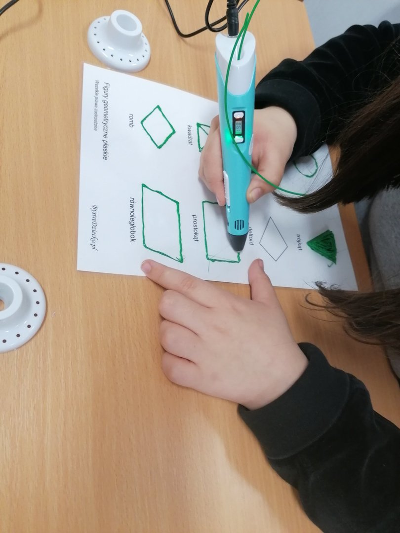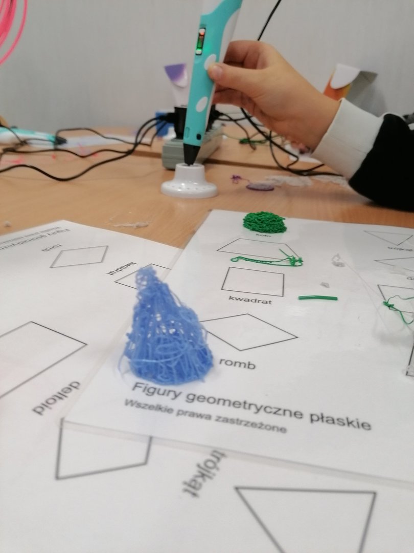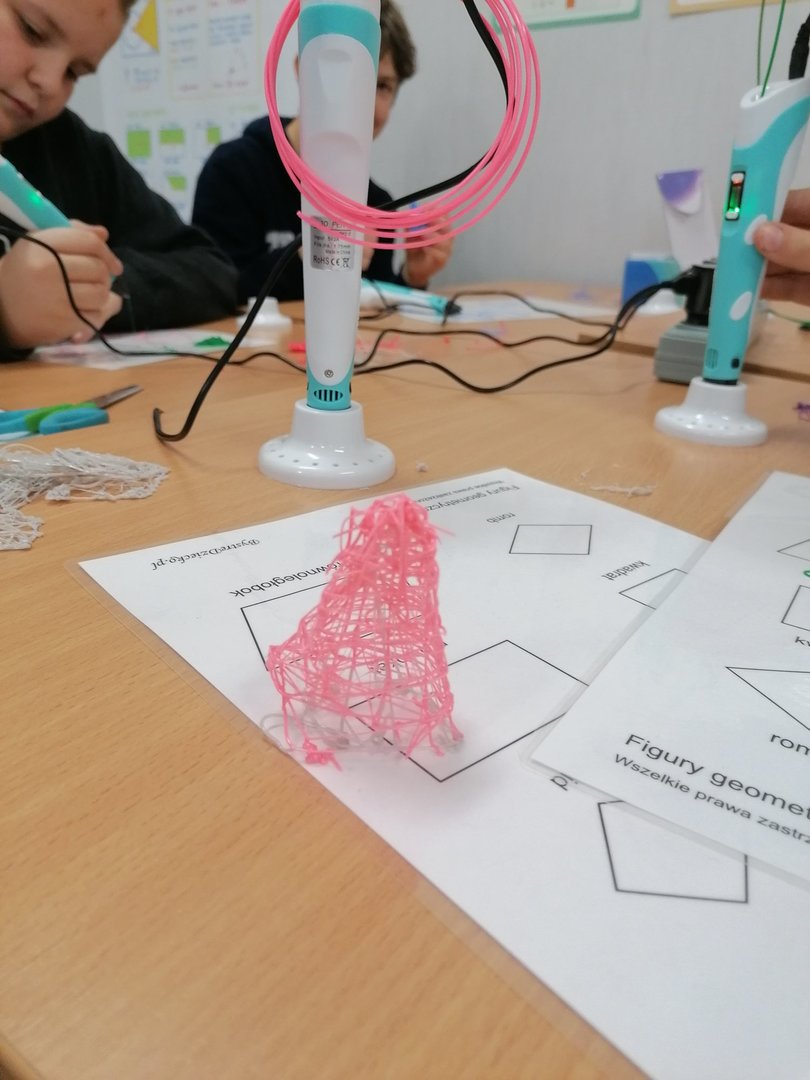 W dniu 4 listopada klasa 7a na zajęciach wyrównawczych wykorzystywała długopisy 3D. Za ich pomocą uczniowie przypomnieli sobie własności figur płaskich oraz tworzyli figury przestrzenne.