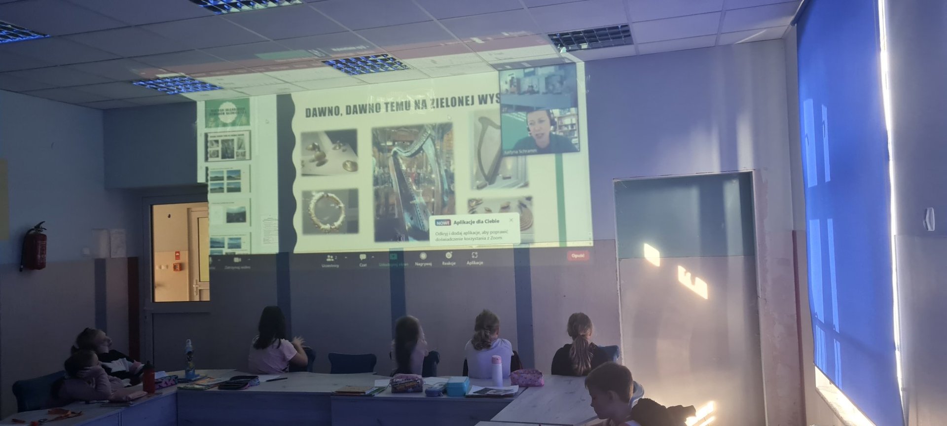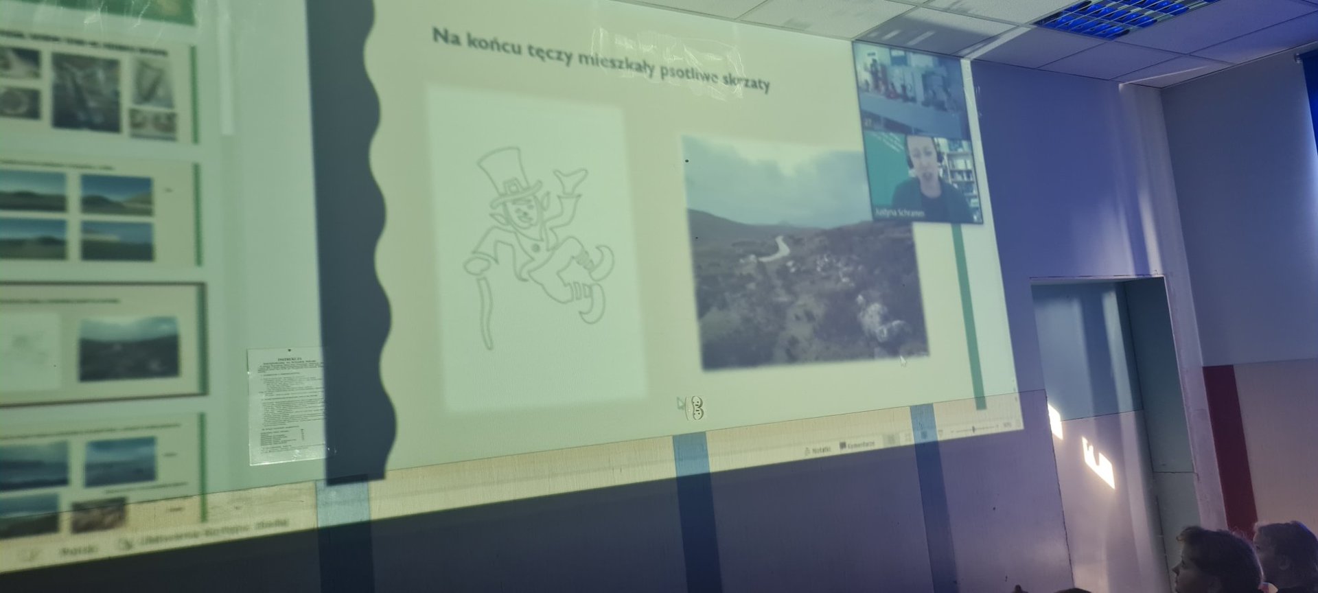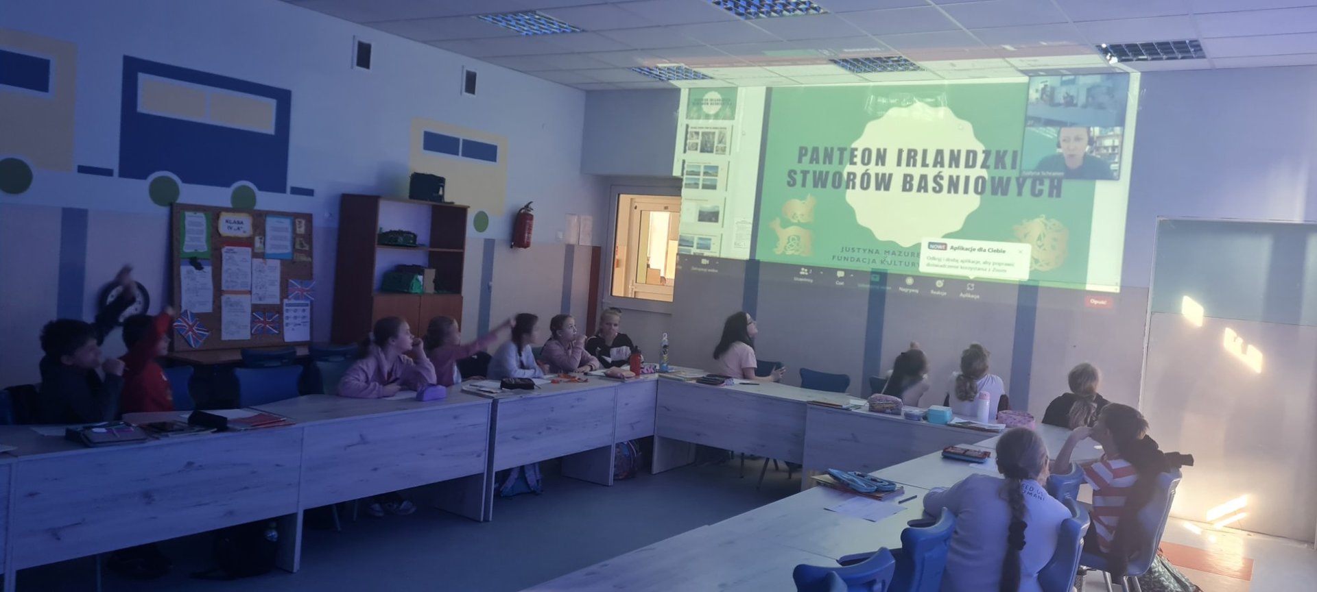 Za pomocą platformy Zoom połączyliśmy się "na żywo" z panią Justyną Mazurek-Schramm z Fundacji Kultury Irlandzkiej, która opowiedziała nam niesamowite historie o takich stworzeniach jak: Merrow (irlandzki syren lub syrenka), Pooka (potrafi zmieniać kształty i być kim chce), Aonbarr (zaczarowany koń władcy mórz i oceanów przedstawiany ze złotymi podkowami, złotym siodłem i uzdą), Sadbh (księżniczka zamieniona w łanię). Poznaliśmy także legendę o wyśmiewanym z powodu długich uszu władcy oraz o panicznie bojącym się fryzjerów królu. Dowiedzieliśmy się, że za rybę mądrości na Zielonej Wyspie uchodzi łosoś, a magicznym instrumentem jest znajdująca się na irlandzkim godle harfa.
