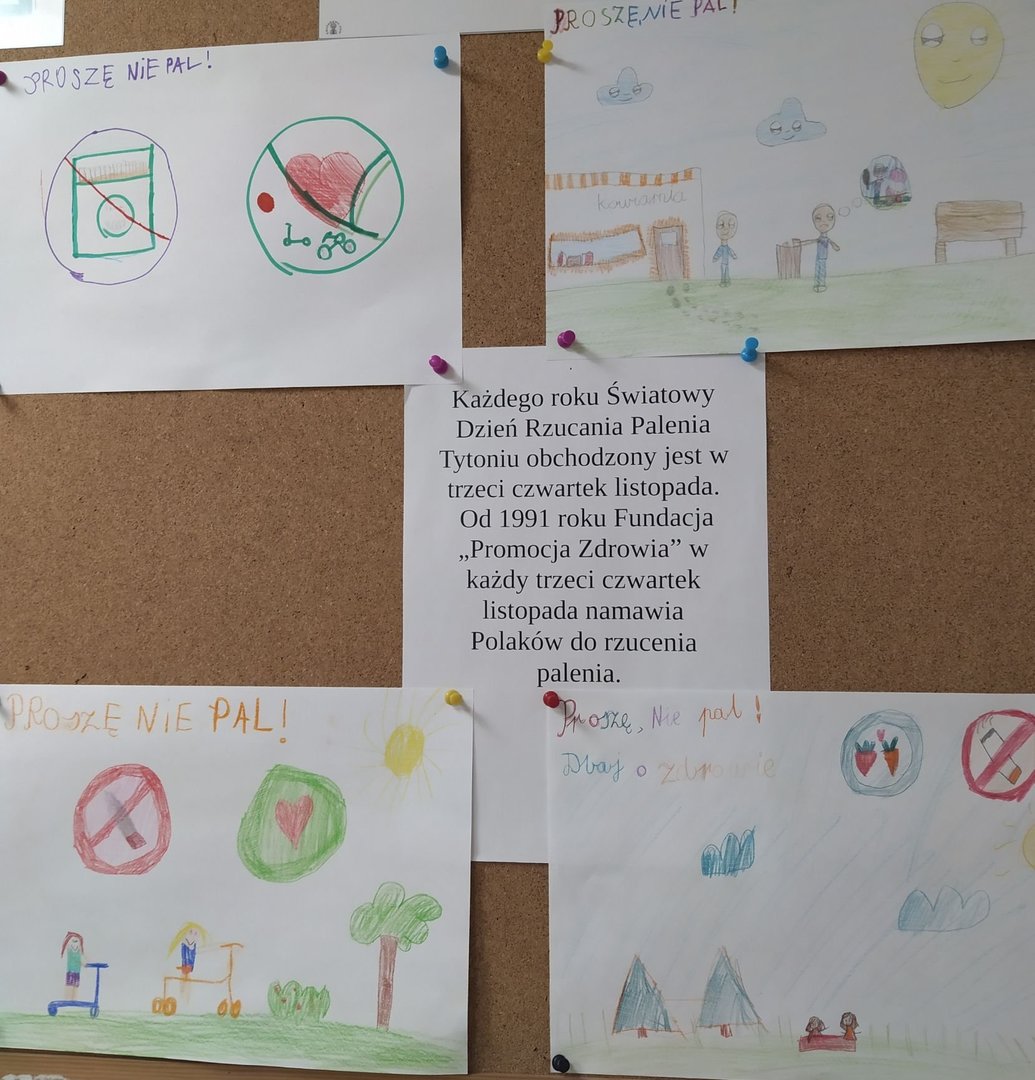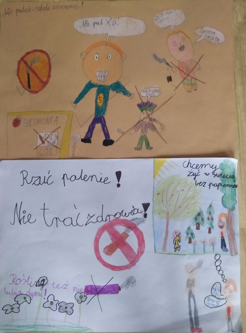 Uczniowie wykonali prace plastyczne – plakaty, projektowały znaki zakazu palenia, znaczek „Nie palę”. Prace zostały wyeksponowane na klasowych gazetkach i gazetce Małego Samorządu.