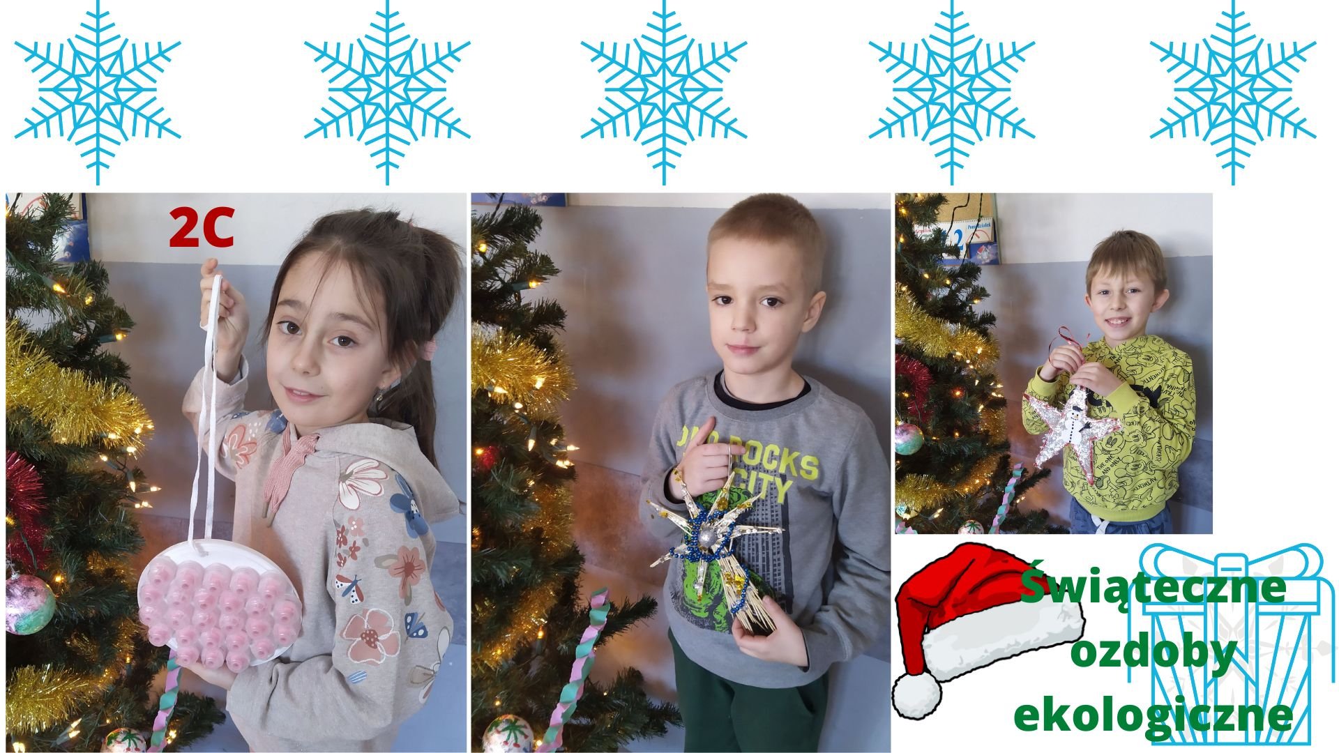 Zostały one wykonane z materiałów ekologicznych (papier,drewno, makaron itp.) oraz surowcówz recyklingu. Wszystkie ozdoby i choinki są wyjątkowe i pokazują, jak w ciekawy sposób można wykorzystywać materiały ekologiczne i jacy kreatywni są nasi uczniowie i ich rodzice.