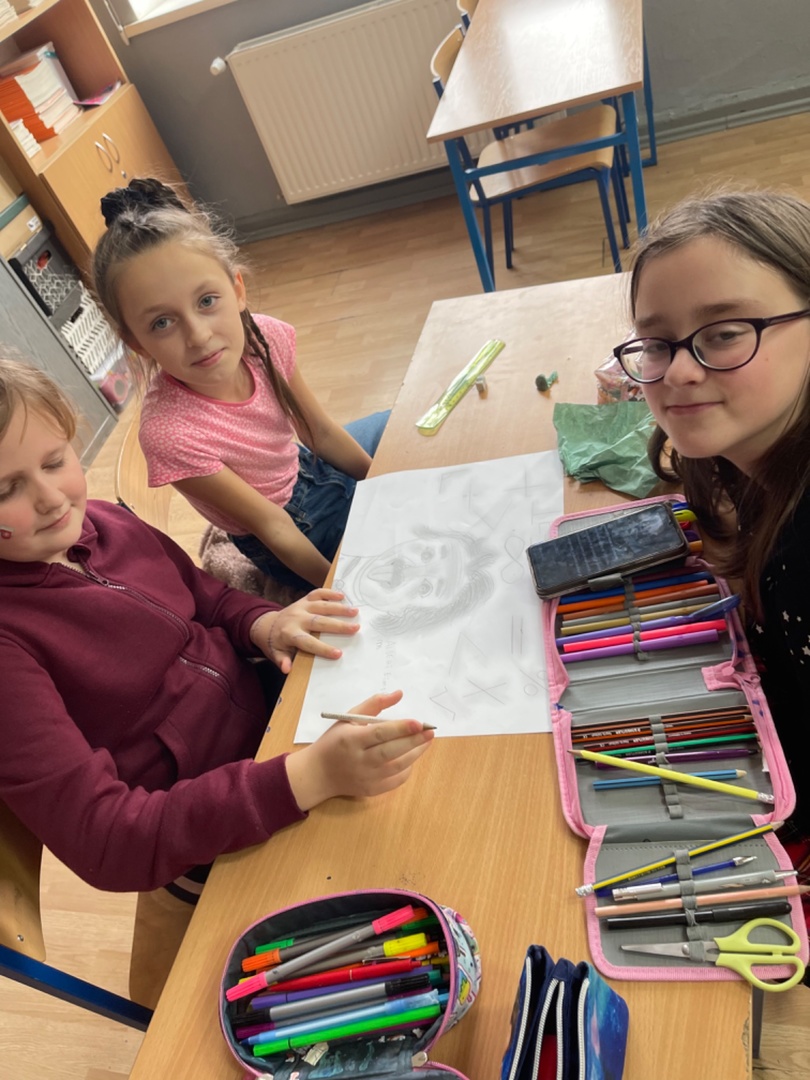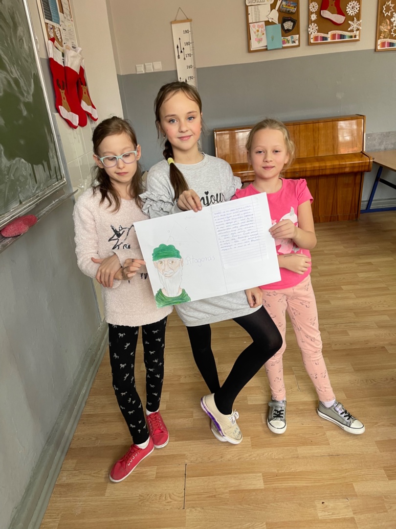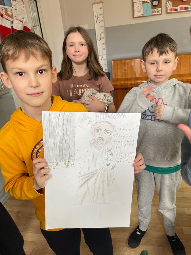 Dnia 11.01 uczniowie klasy 4 A 🥇🪄w trakcie zajęć dodatkowych wykonali gazetki ścienne, których bohaterami byli znani matematycy. Uczniowie zapoznali się z biografiami m.in. Pitagorasa, Talesa i Einsteina.