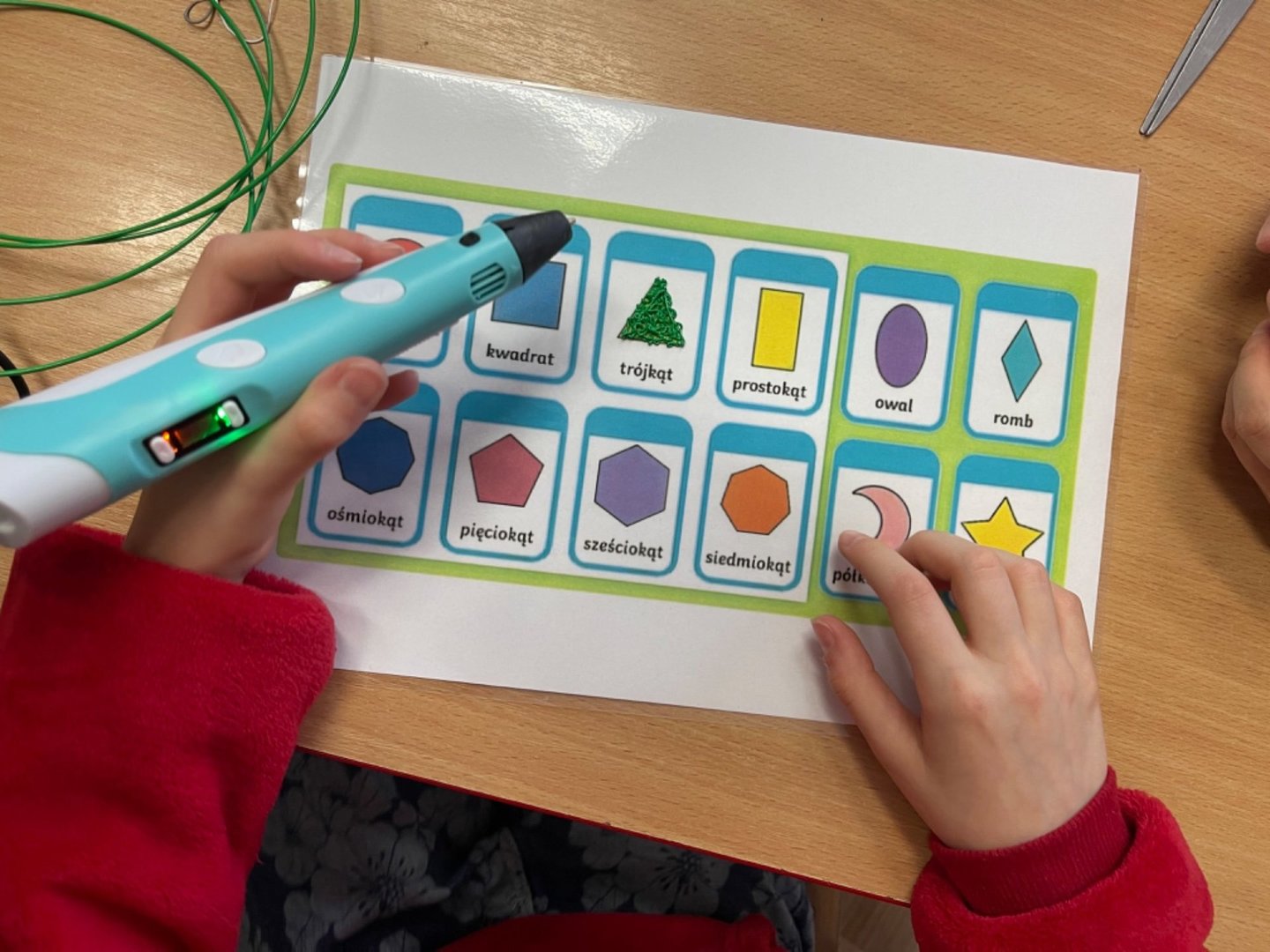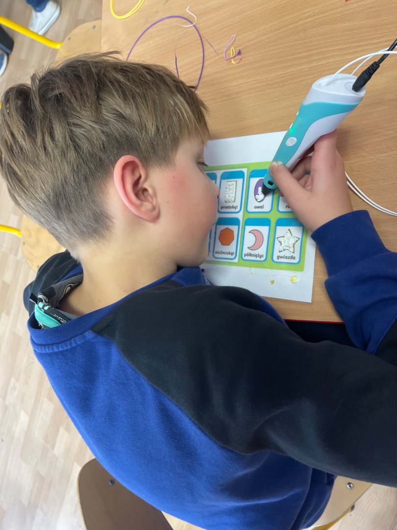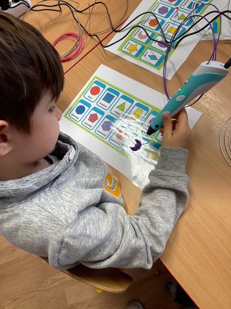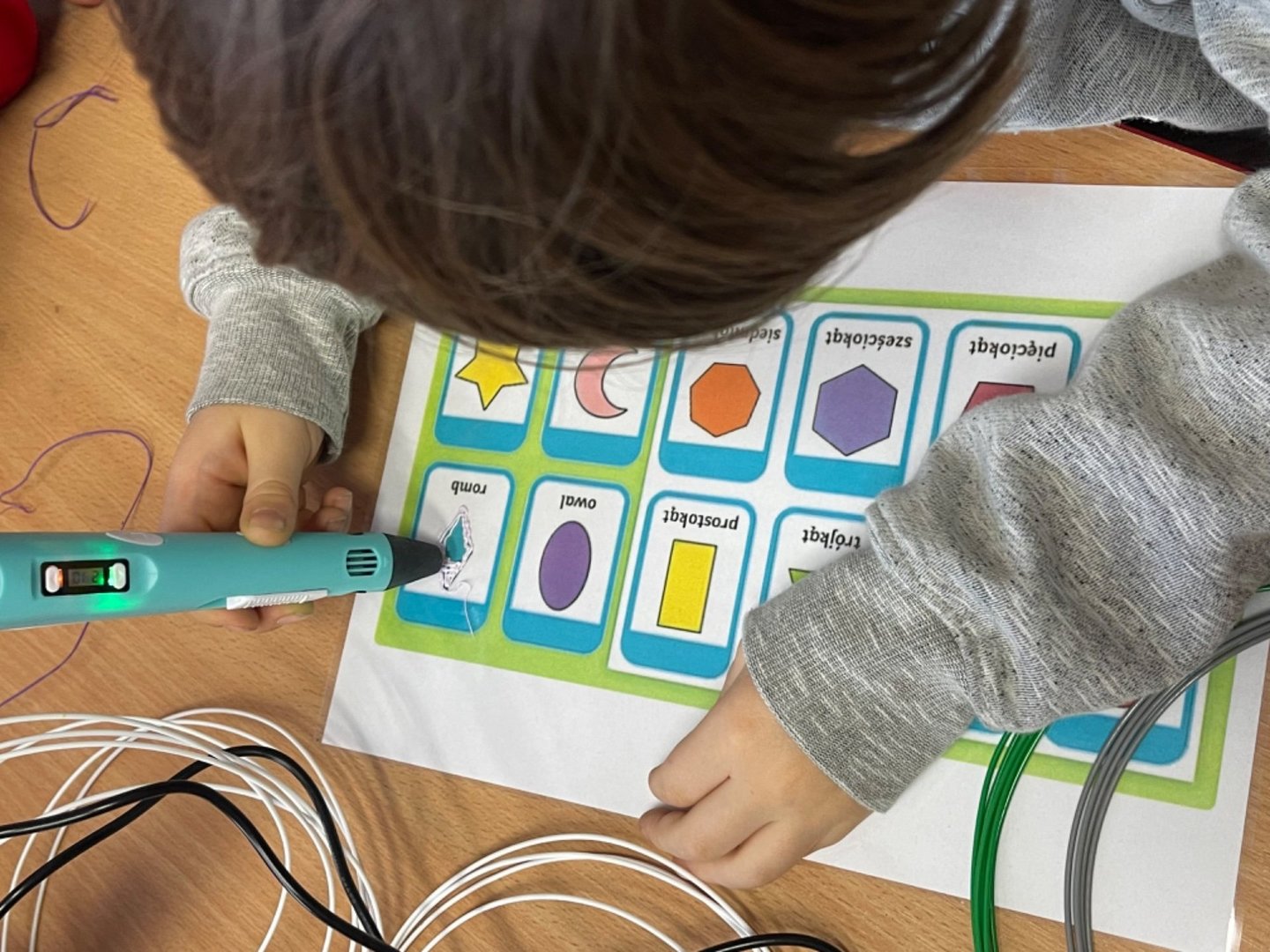 Najpierw dzieci rysowały figury (🟣🔺🔶🟪♦️) poznając jednocześnie ich właściwości. Dzieci podawały przykłady występowania figur płaskich w naszym codziennym otoczeniu. Dzięki #laboratoriaprzyszlosci korzystaliśmy z długopisów 3D.