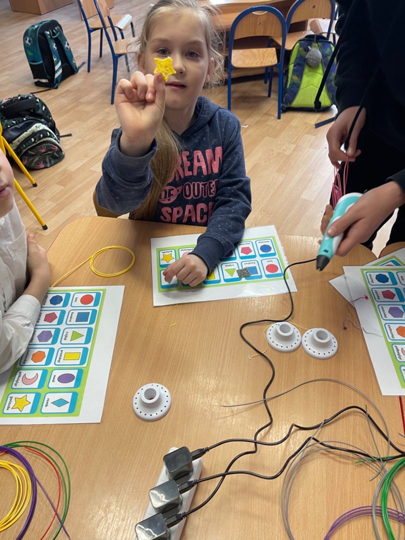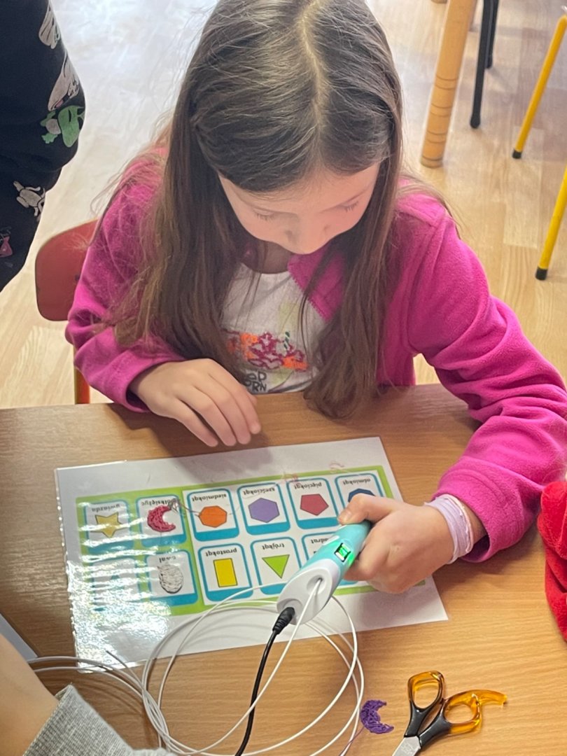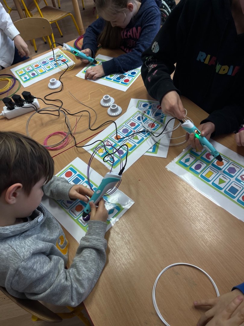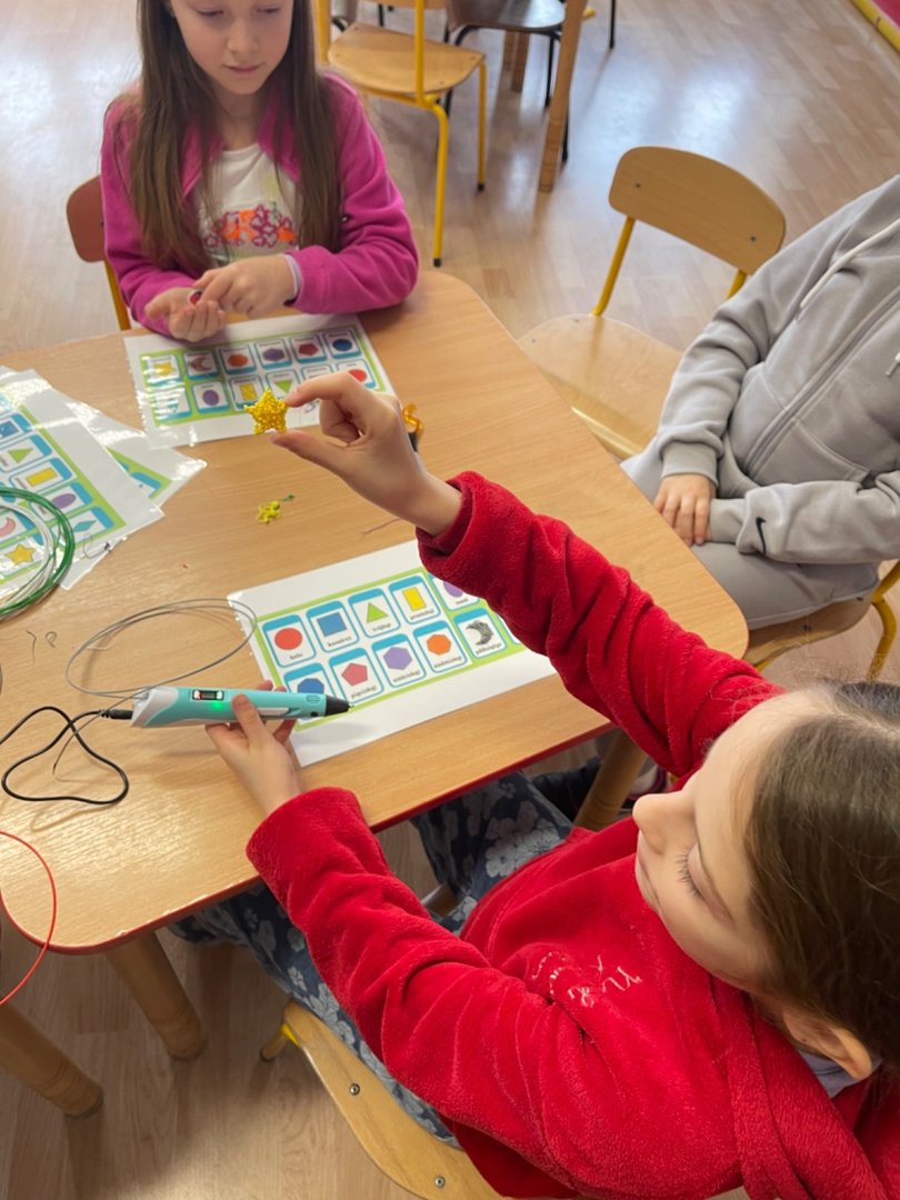 Najpierw dzieci rysowały figury (🟣🔺🔶🟪♦️) poznając jednocześnie ich właściwości. Dzieci podawały przykłady występowania figur płaskich w naszym codziennym otoczeniu. Dzięki #laboratoriaprzyszlosci korzystaliśmy z długopisów 3D.