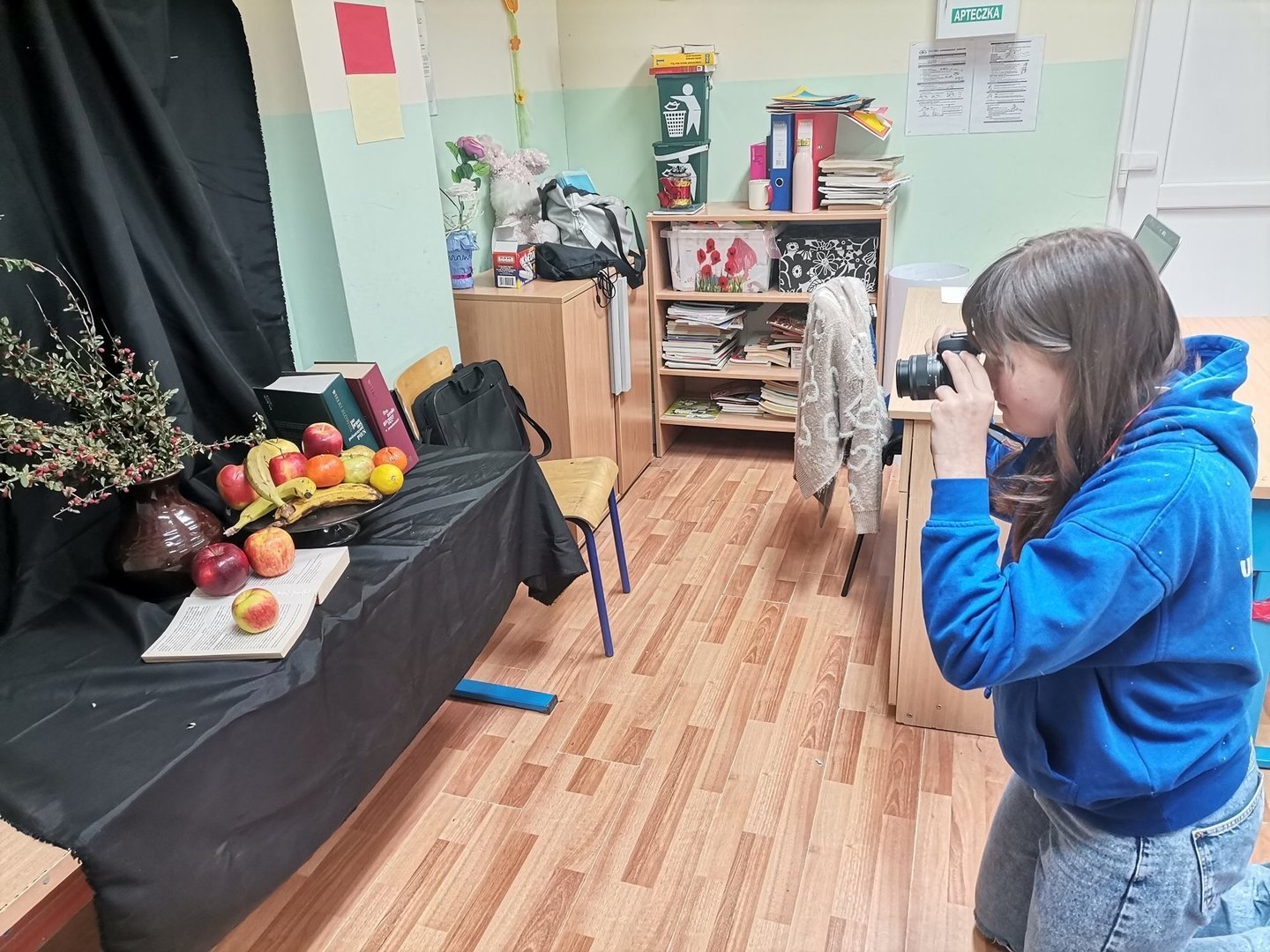 Najpierw uczniowie zapoznali się z budową takiego aparatu, potem wspólnie ułożyli kompozycję, która w trakcie robienia zdjęć ulegała małym modyfikacjom, a następnie przystąpili do fotografowania.