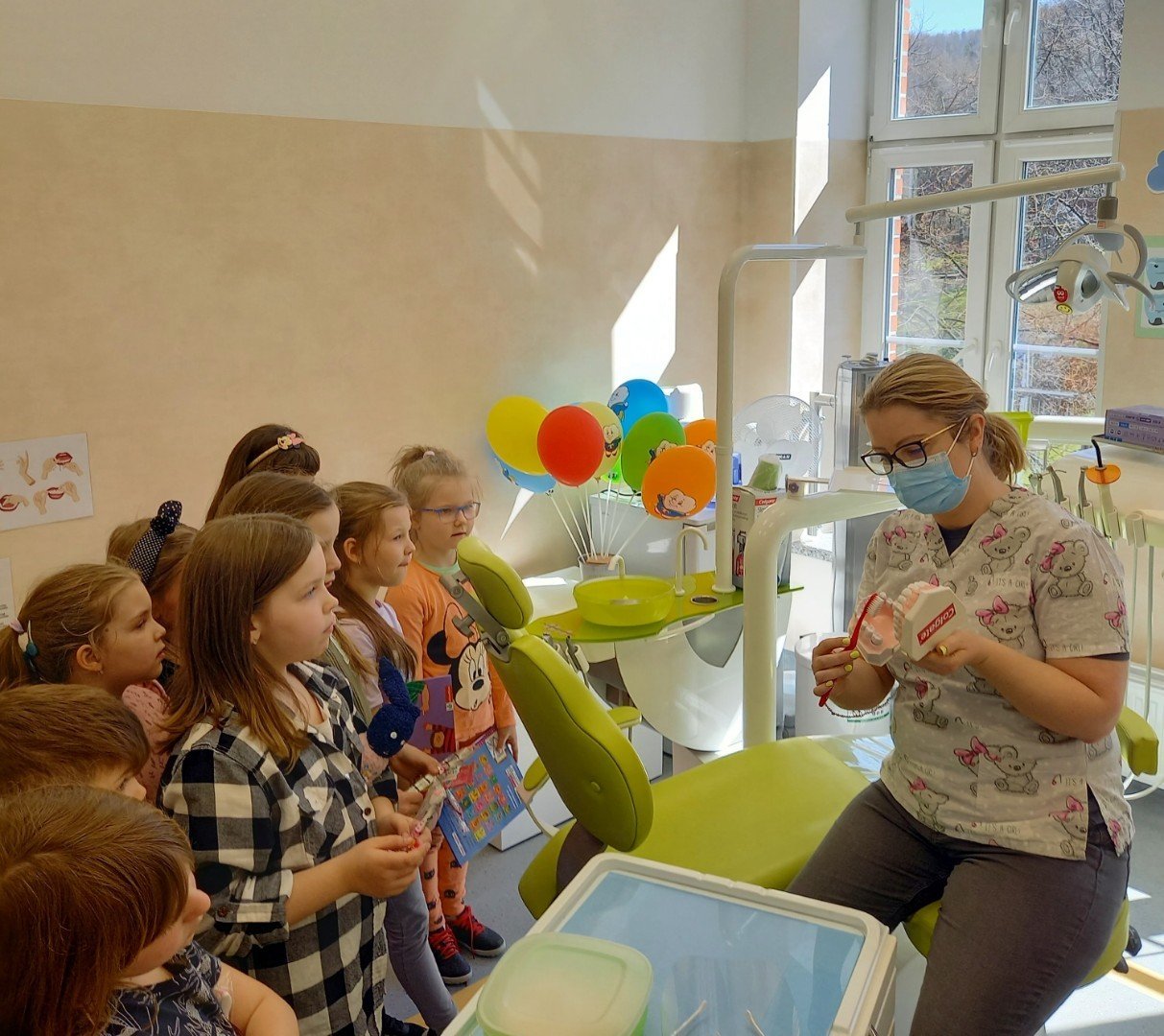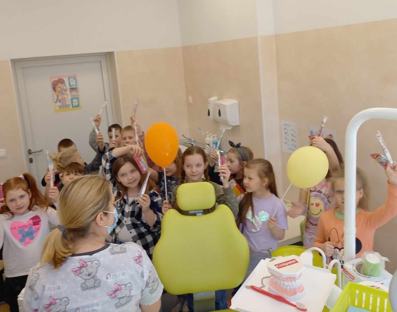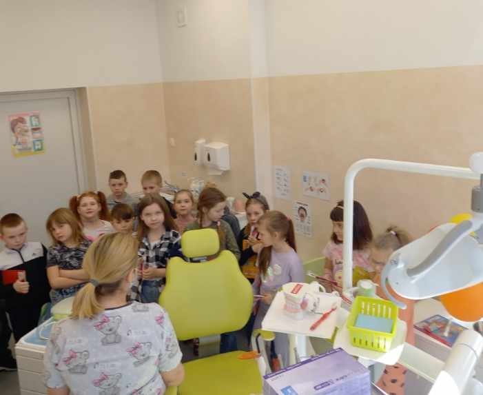Pierwszaki odwiedziły nowy gabinet stomatologiczny. Pani doktor opowiadała uczniom o zasadach higieny jamy ustnej oraz prawidłowych nawykach żywieniowych które, mają wpływ na zdrowe zęby.