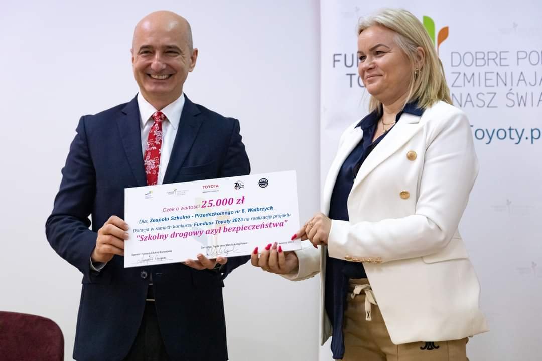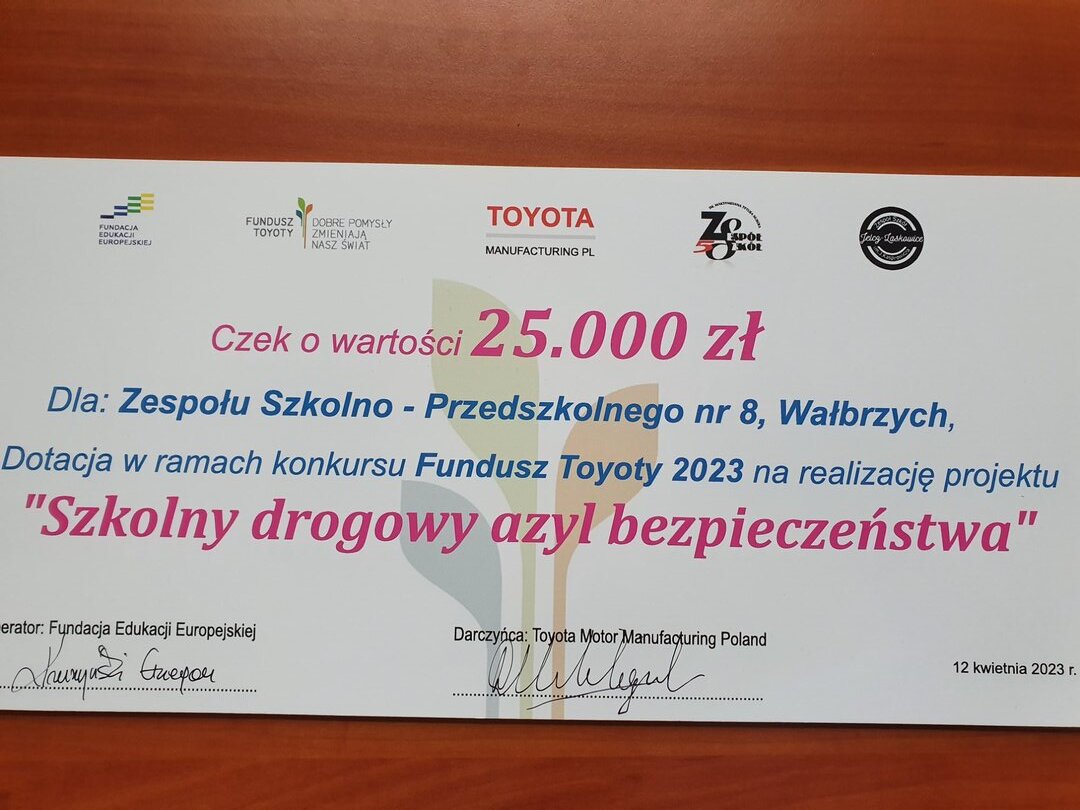 21.04.2023 odebraliśmy symboliczny czek o wartości 25000zł jako dotację w ramach konkursu Fundusz Toyoty 2023 na realizację naszego projektu "Szkolny drogowy azyl bezpieczeństwa".