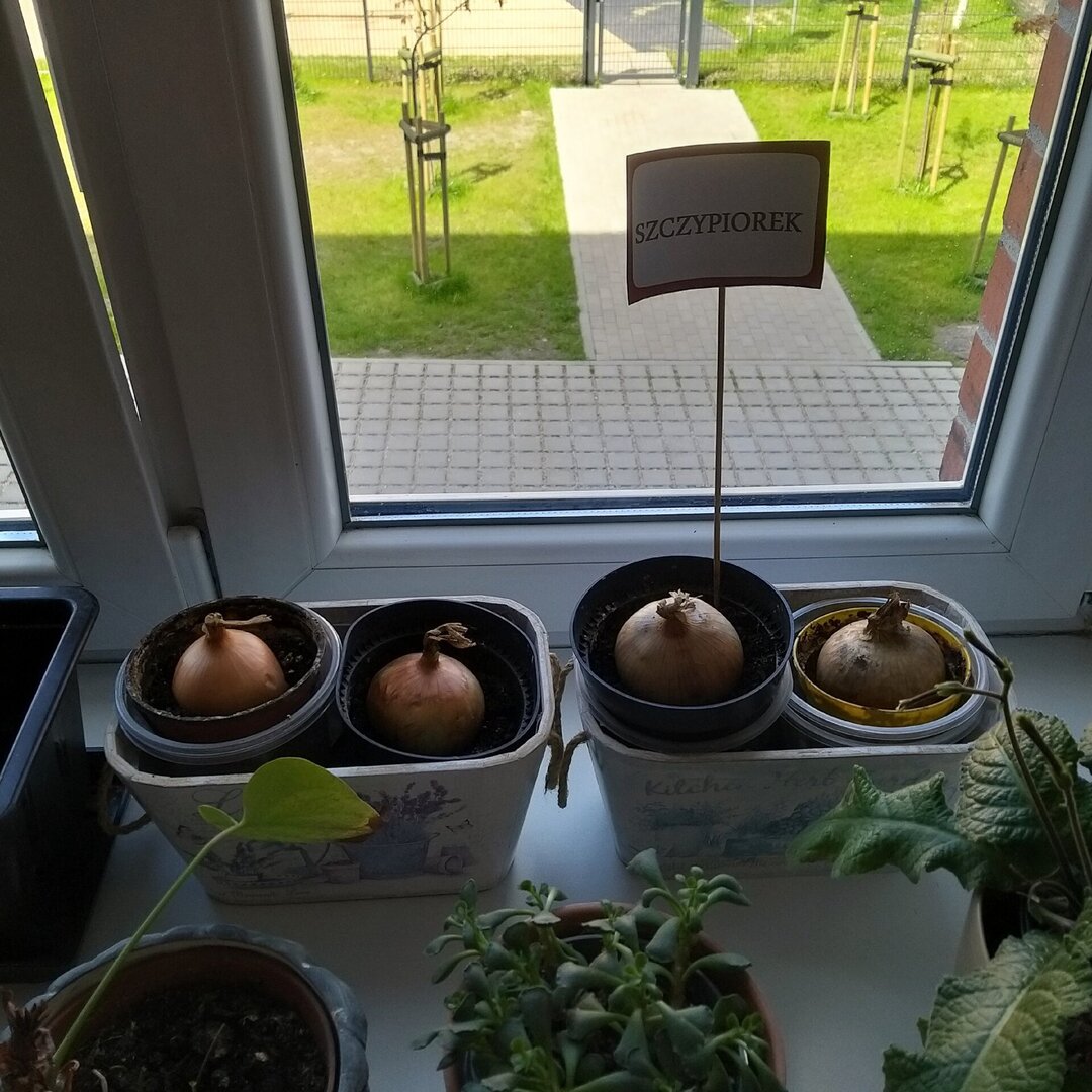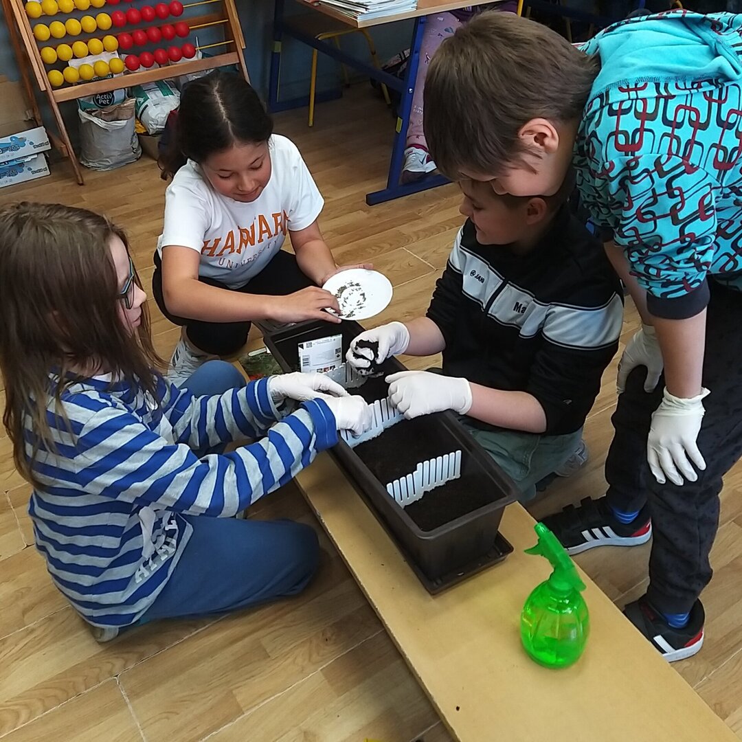 Dzieci posiały koperek, pietruszkę, bazylię i rukolę. Wsadziły do ziemi cebulki, aby urósł szczypiorek.