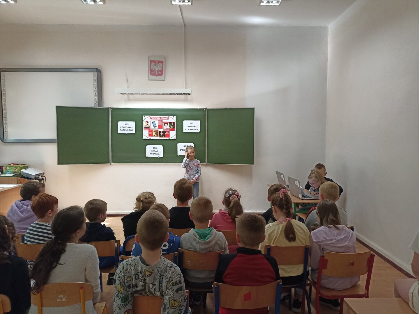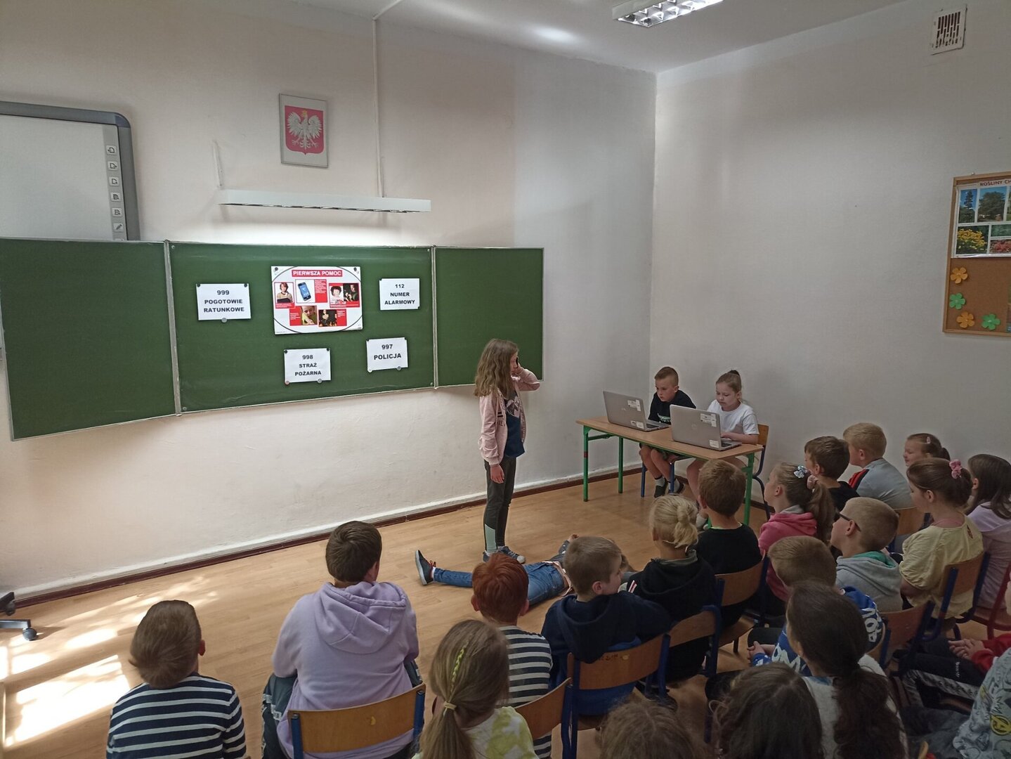 Wykorzystując scenki dramowe, uczniowie klasy I c przypomnieli sobie i pozostałym uczniom numery alarmowe oraz poprzez ćwiczenia praktyczne, przedstawili poprawny sposób zachowania w przypadku konieczności wezwania pomocy.