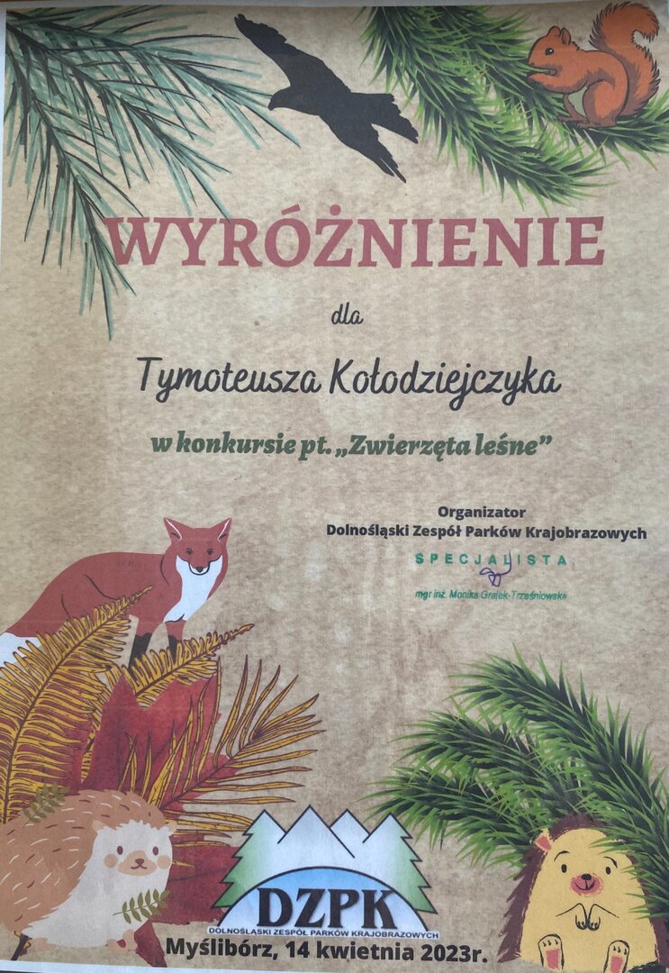 Tymoteusz Kołodziejczyk otrzymał wyróżnienie w wojewódzkim konkursie plastycznym pt. „Zwierzęta leśne”. Celem konkursu było wykonanie/przedstawienie wybranego zwierzęcia leśnego (nie rysunek) tak, by uwydatnić jego jakąś charakterystyczną cechę. Praca miała być przestrzenna. Do pracy należało dołączyć krótki tekst (kilka zdań), dlaczego właśnie to zwierzę stało się tematem pracy (dlaczego nam się podoba lub czemu się go boimy). Tymek opisał Kruka zwyczajnego. Organizatorem konkursu był Dolnośląski Zespół Parków Krajobrazowych O/Legnica, Myślibórz.