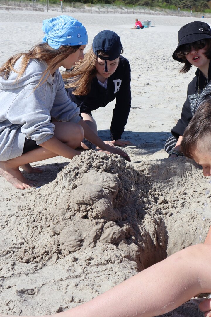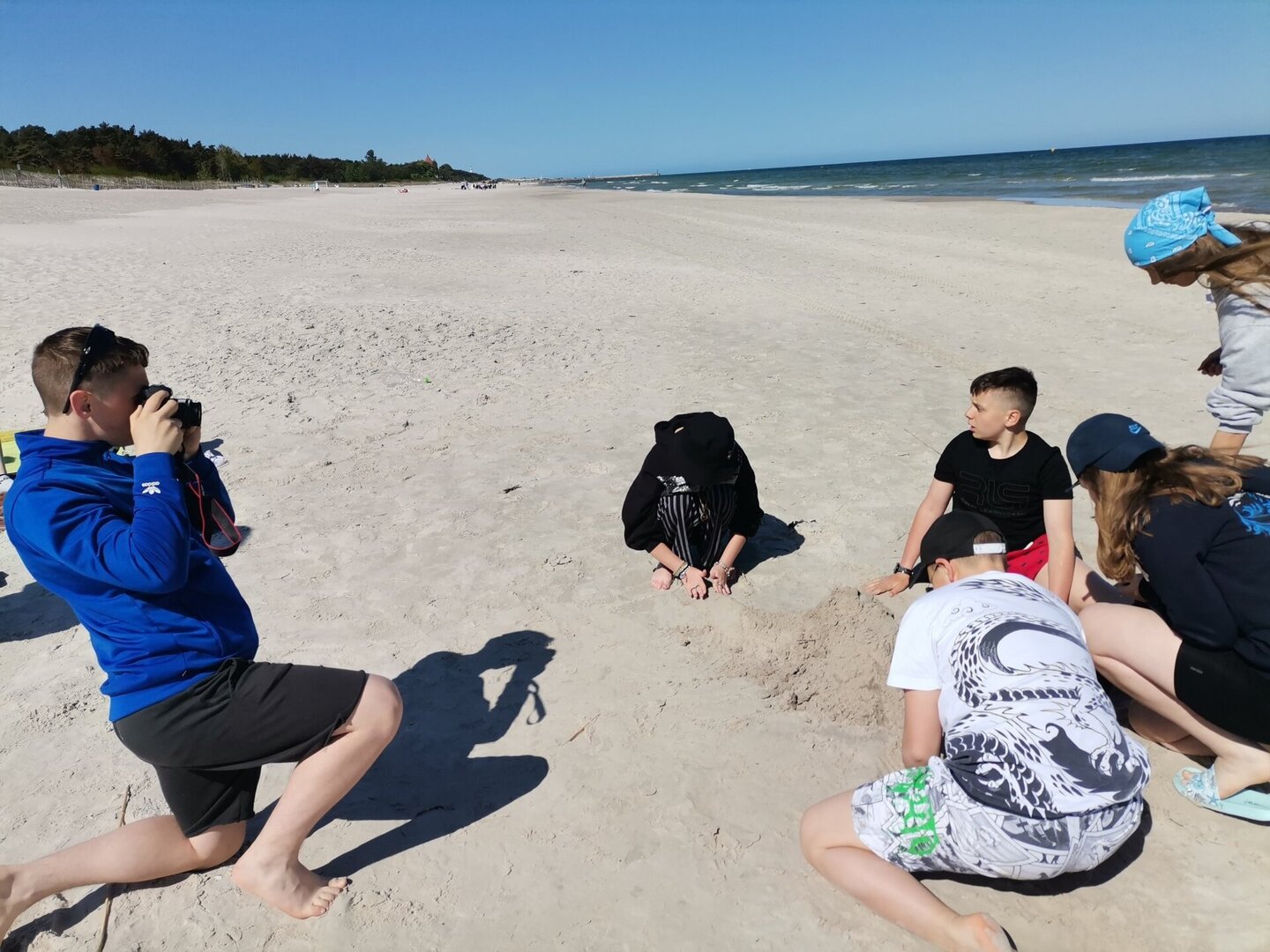 Korzystając z okazji "posiadania" niezliczonej ilości materiału plastycznego jakim był nadmorski piasek uczniowie wykonywali płaskorzeźby z pisaku, jednocześnie fotografując swoje dzieła przy użyciu aparatu zakupionego w ramach programu Laboratoria Przyszłości. Powstały delfiny, żółwie, samochody oraz tradycyjne zamki, a praca w grupach przysporzyła uczniom wiele radości.