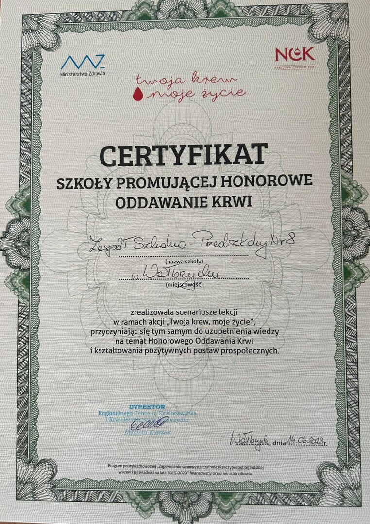 Nasza szkoła otrzymała Certyfikat Szkoły Promującej Honorowe Oddawanie Krwi z czego jesteśmy bardzo dumni.