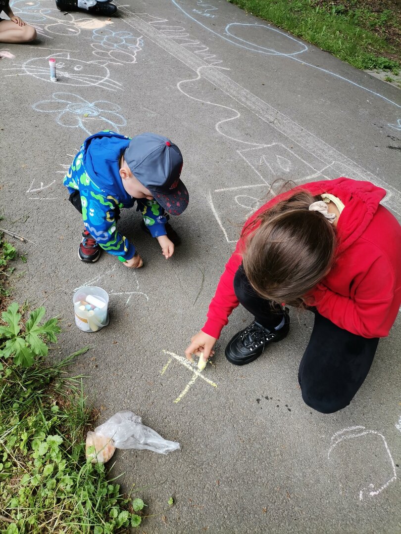 Potem, dla odpoczynku, zajęliśmy się grami planszowymi. Świetnie się bawiliśmy przy grze „Skaczące jajeczka” polegającej na zebraniu jak największej liczby jajek poprzez rzucanie kostką i wykonywaniem jak najszybciej poleceń. Była gra w klasy, rysowanie kredą na chodniku czy kulanie się po świeżym sianku.
