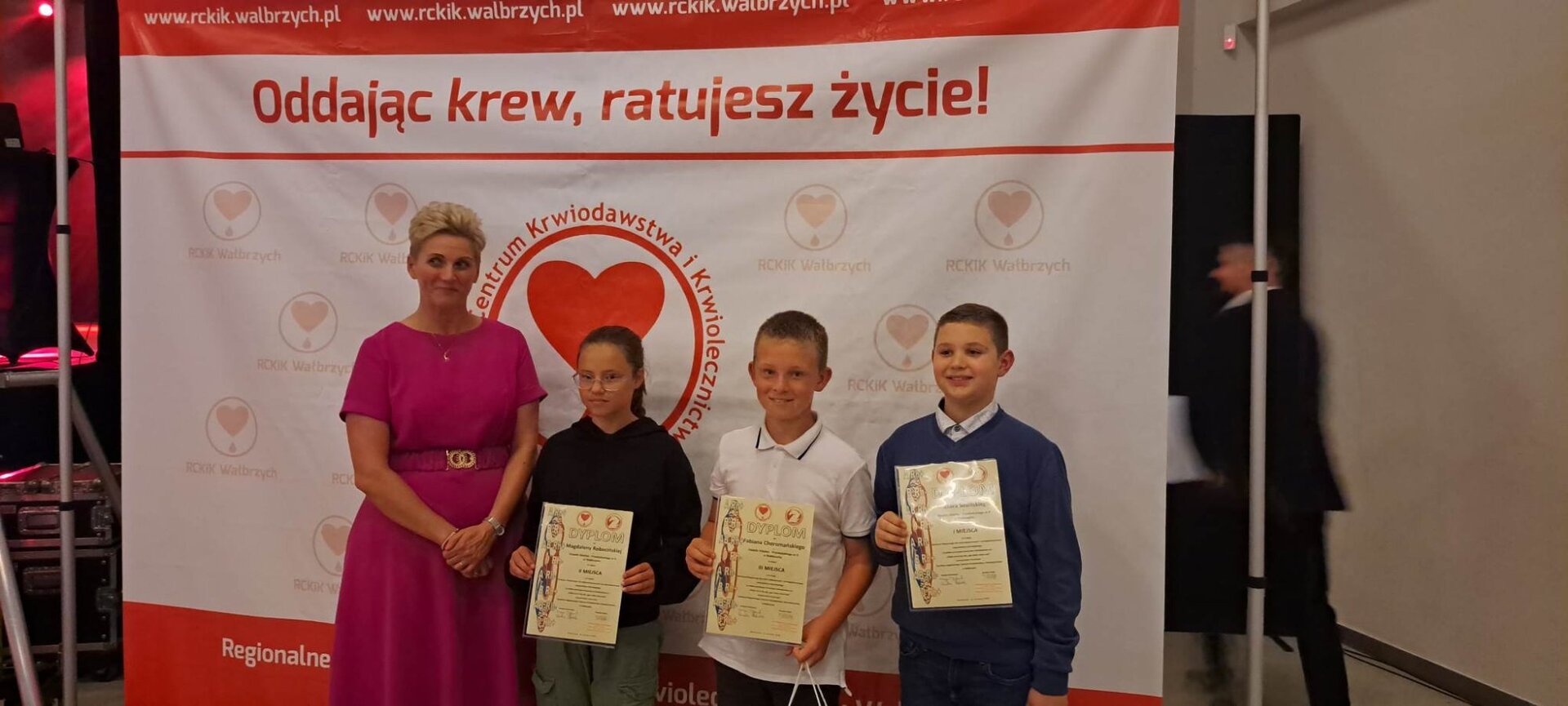 Kończymy rok szkolny kolejnym sukcesem plastycznym. Miło nam jest poinformować, że nasi uczniowie zostali laureatami II Edycji Konkursu Plastycznego dla szkół podstawowych i ponadpodstawowych województwa dolnośląskiego na plakat promujący honorowe krwiodawstwo pn. : „Pokaż na co Cię stać, gdy siebie chcesz dać”.