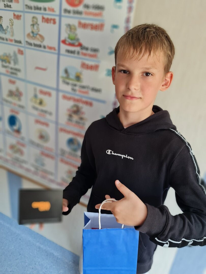 Dziś prezenty z okazji Dnia Chłopca otrzymała męska część klasy 5 "a". Na zdjęciu widzimy Filipa z podarkiem od koleżanek - voucher do Cinema City plus słodycze z pewnością umilą wszystkim czas!
