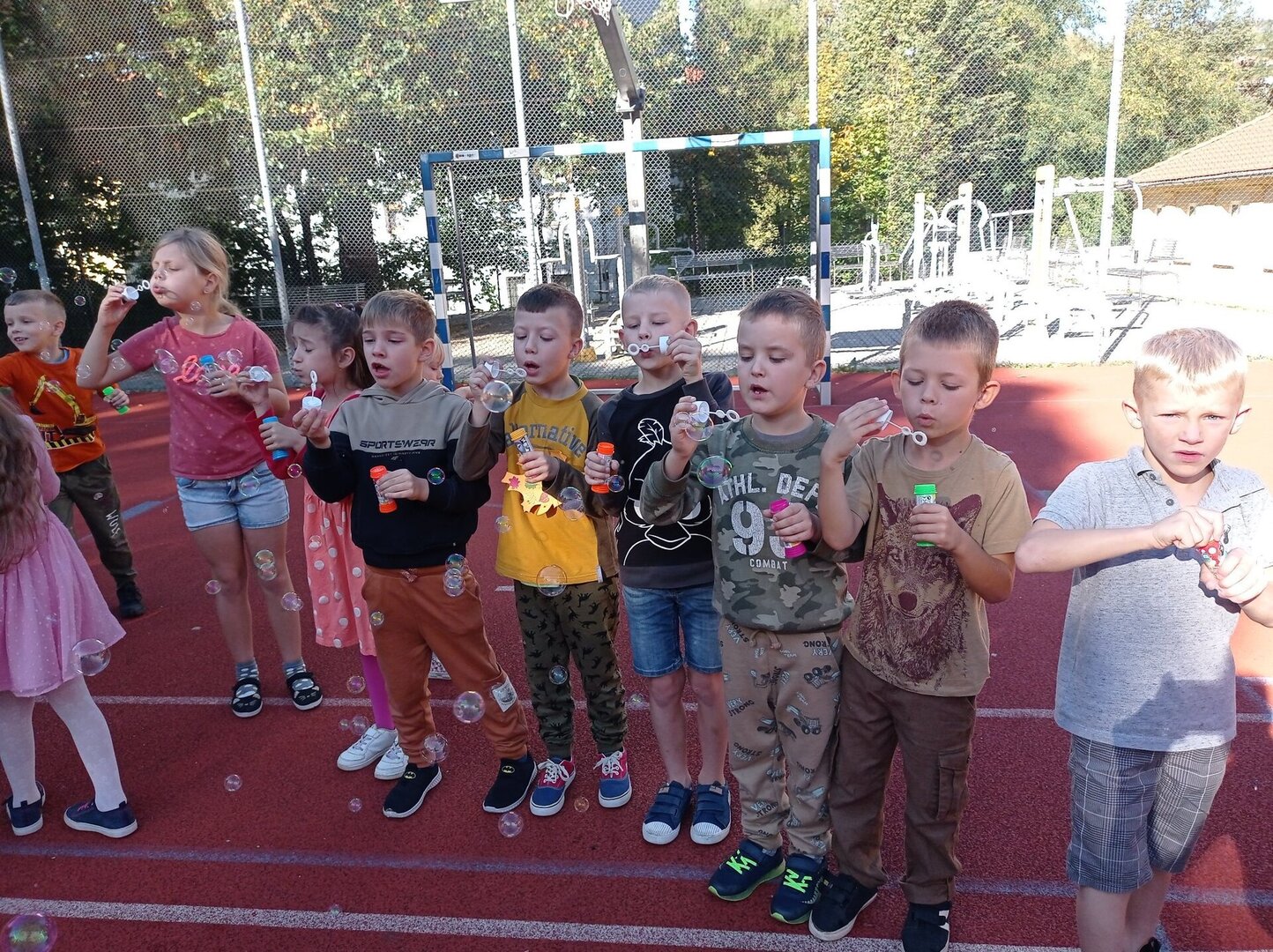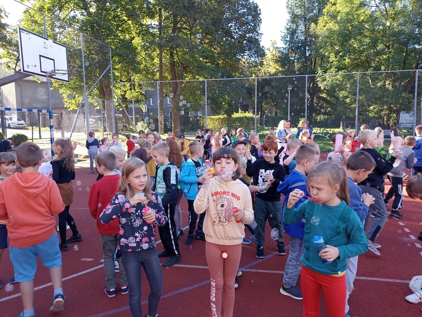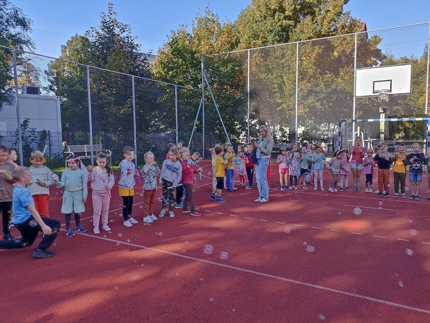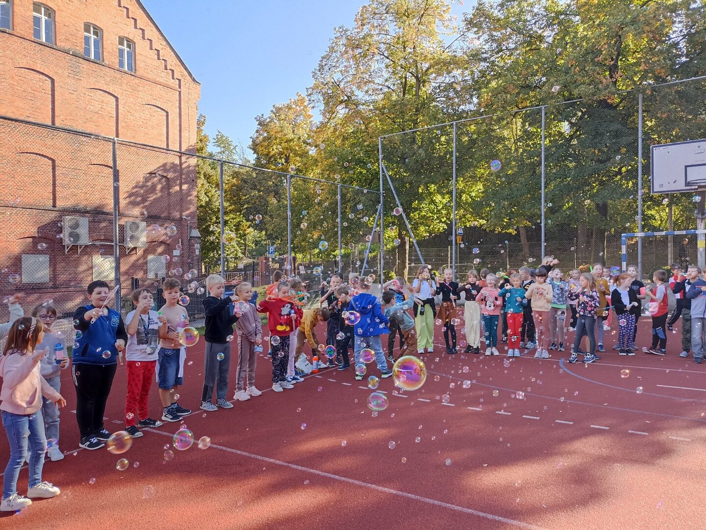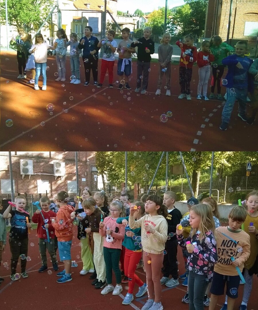 Najmłodsi uczniowie naszej szkoły po raz pierwszy w szczególny sposób pożegnali odchodzące lato i przywitali jesień. Dzieci ubrane w barwy jesienne spotkały się na boisku szkolnym, aby wspólnie obchodzić to wydarzenie. W tym dniu niebieskie niebo wypełniły olbrzymie, kolorowe bańki mydlane. Śmiechu z doskonałej zabawy było mnóstwo! W wesołej atmosferze pożegnaliśmy lato i przywitaliśmy jesień.