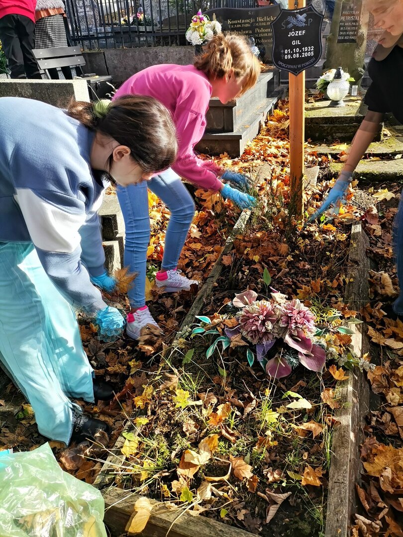 - klasa 3 "b", uczniowie wszystkich klas 5 (5 "a", 5 "b", 5 "c" oraz wolontariusze udali się na pobliski cmentarz i uporządkowali teren wokół grobów;