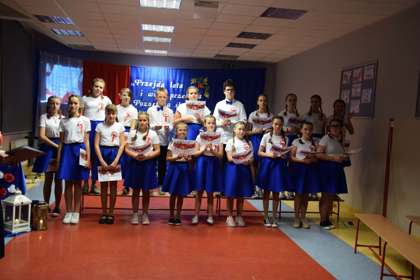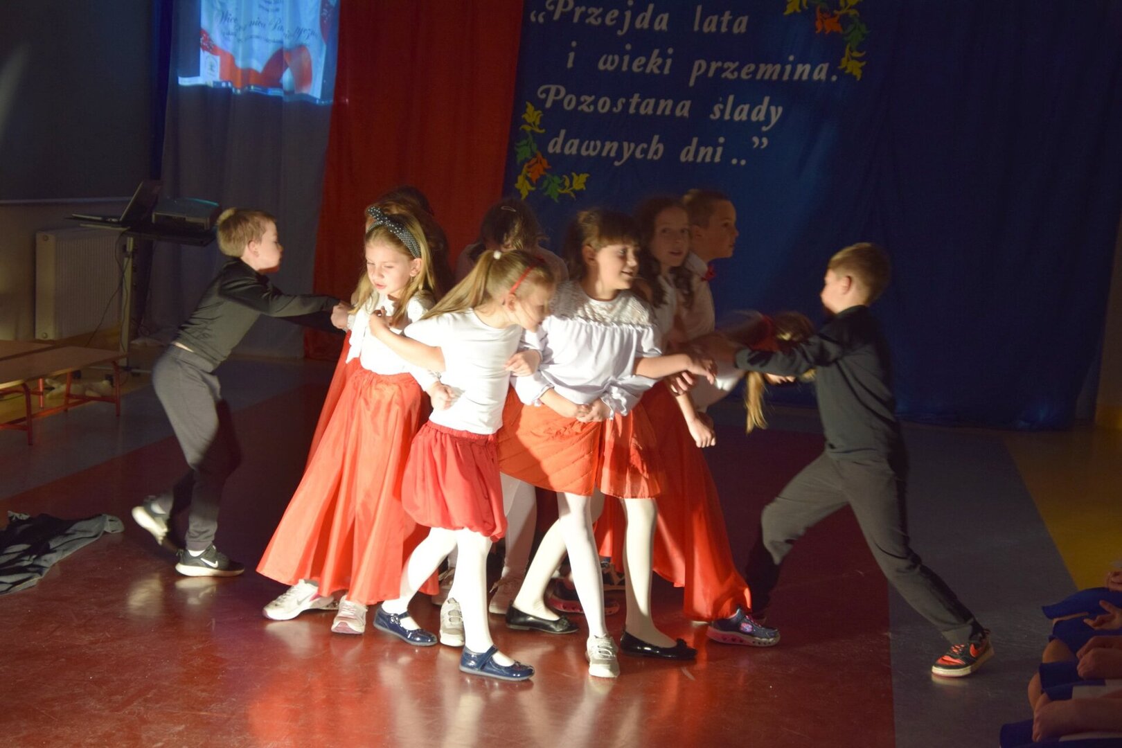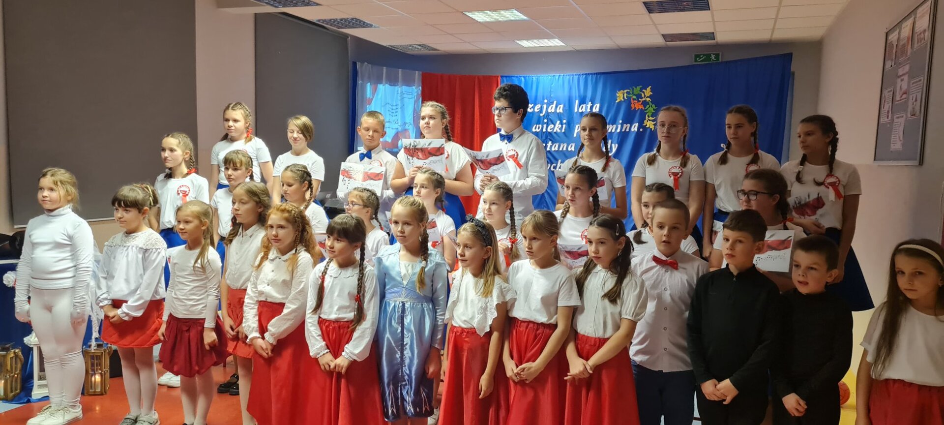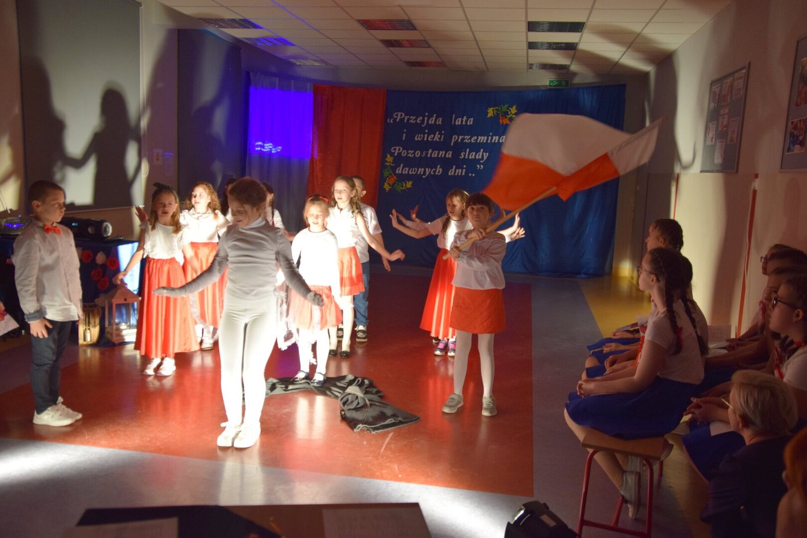 W montażu muzyczno-poetyckim, połączonym z etiudą teatralną w wykonaniu uczniów klas 2 "c" i 3 "a" (p. Ewa Hoppe, Elżbieta Wróbel i Arletta Lenkiewicz - przygotowanie) z rozrzewnieniem wspominaliśmy bohaterów walki o niepodległość, tych "gigantów" (jakby powiedziała współczesnym językiem młodzież) - naszej pięknej, choć nie zawsze łatwej historii.
