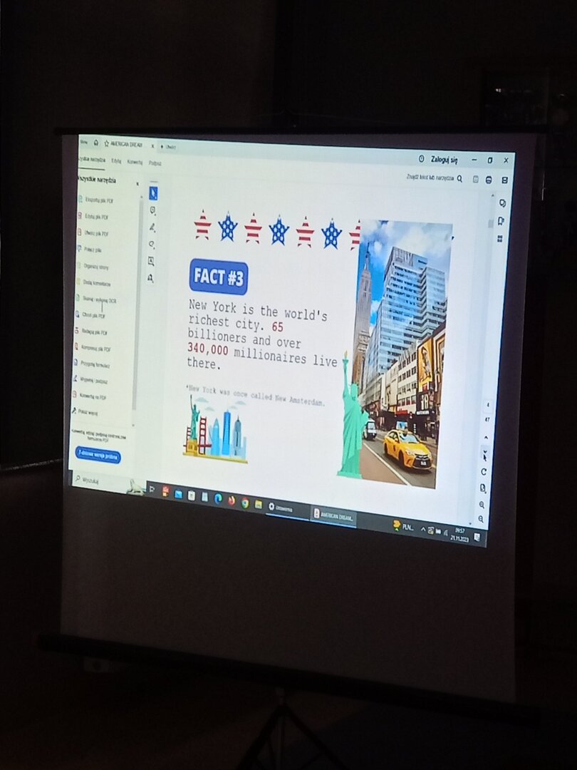 "Facts you probably didn't know ABOUT THE USA" - pod takim hasłem w ramach trwającego w naszej szkole od wczoraj AMERICAN DREAM WEEK, odbyła się otwarta lekcja języka angielskiego dla klas piątych.