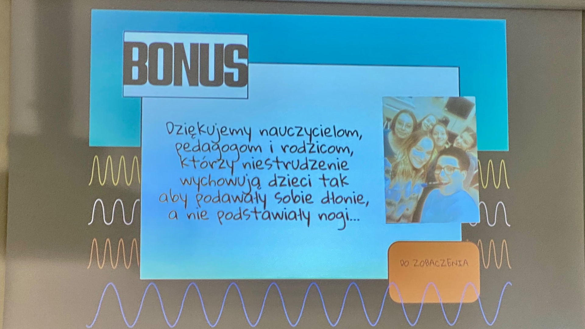 Dziś podczas konferencji, która odbyła się w Miejskim Ośrodku Pomocy Społecznej, mieliśmy okazję zobaczyć podsumowanie całego projektu. Przedstawiony został film profilaktyczny 🎬🎬 z udziałem wszystkich liderów reprezentujących swoje szkoły. Materiał był bardzo uczący i poruszający.