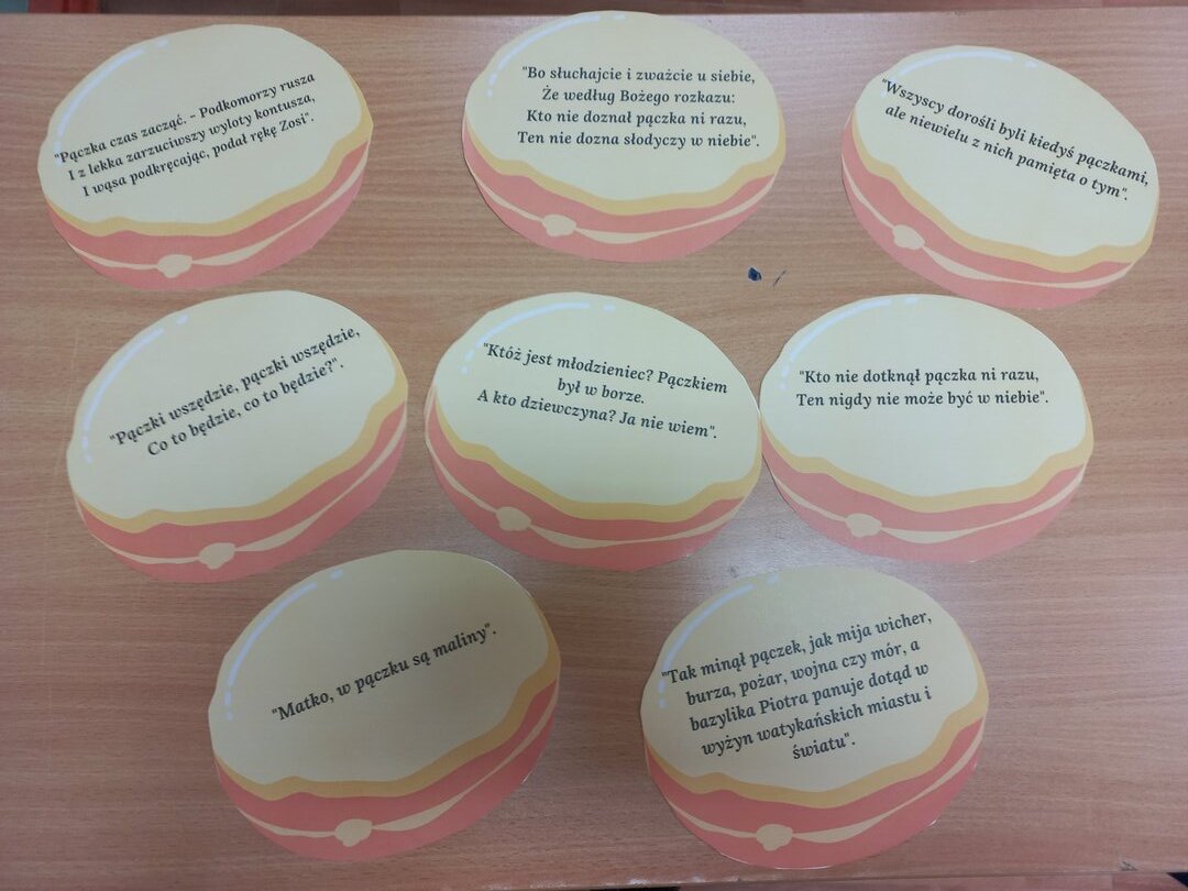 Z okazji świętowania Tłustego Czwartku, klasy 7 i 8 na długiej przerwie miały za zadanie odgadnąć autorów i tytuły lektur obowiązkowych na podstawie cytatów, w których dodatkowym utrudnieniem było znalezienie prawidłowego słowa, zastąpionego słowem "pączek". Prawidłowe odpowiedzi spływały do pań M. Leszczyńskiej, E. Bibrowskiej i A. Drubko, a nagrody za prawidłowe wykonanie zadania stanowiły: pączki, plusy i oceny. Szczególnie aktywne były klasy 7b i 8b, za co bardzo dziękujemy:).