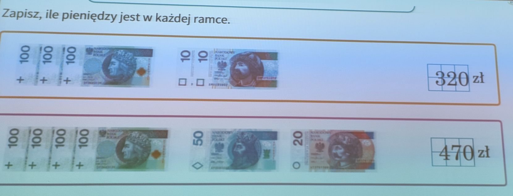 Ćwiczono dodawanie i odejmowanie w zakresie 1000, umiejętności wydawania reszty w oparciu o obliczenia matematyczne, rozwiązywano zadania tekstowe.