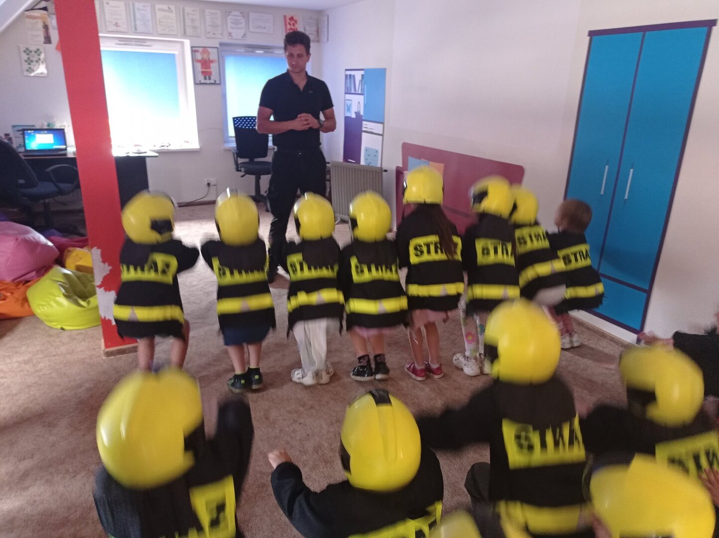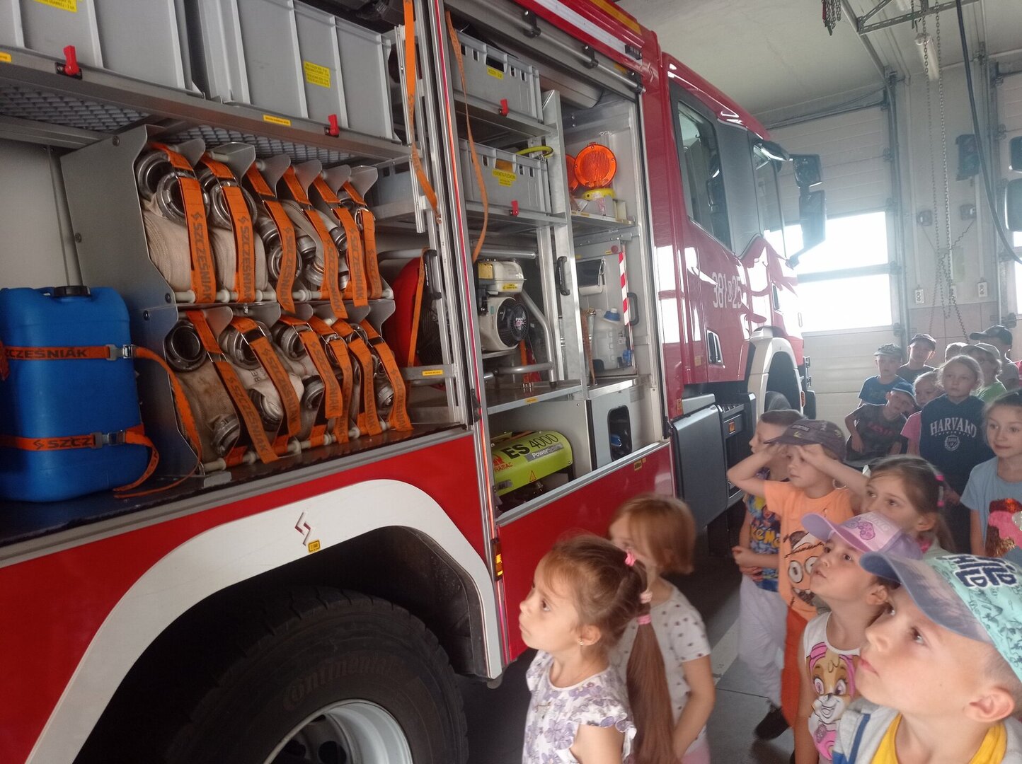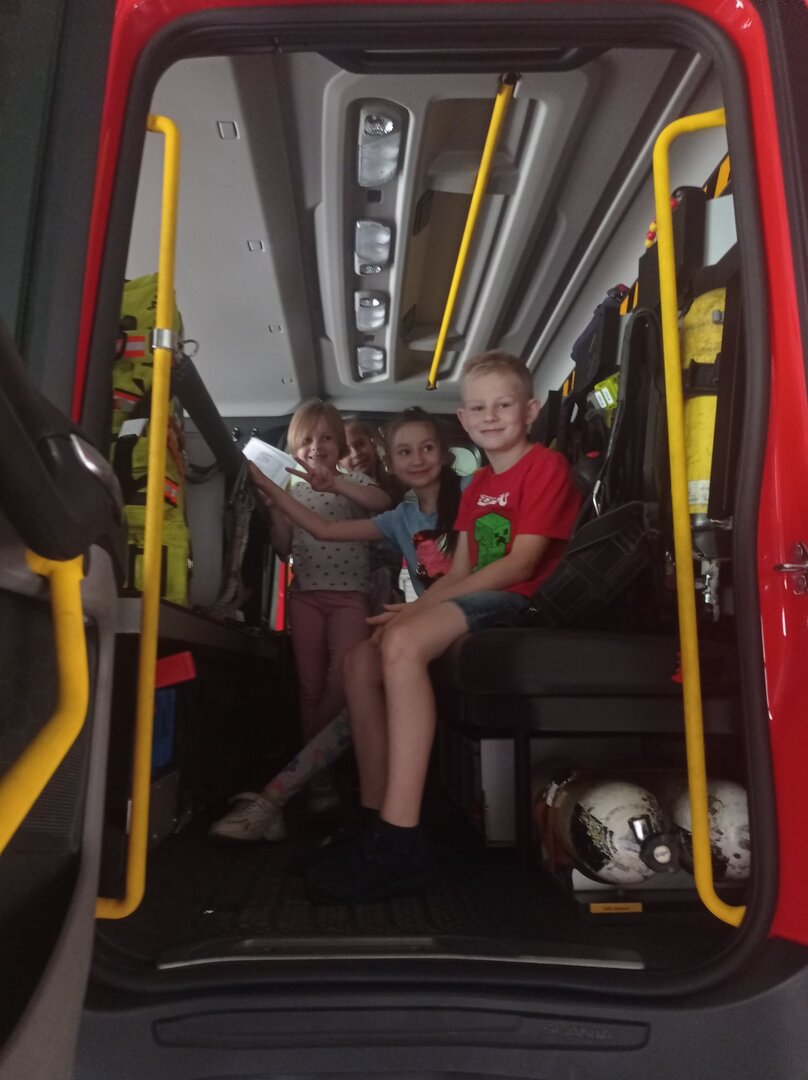 Dzięki życzliwości strażaków, dzieci mogły z bliska przyjrzeć się tak ciężkiej pracy, miały możliwość zobaczyć i dotknąć niemalże każdej rzeczy. Pan Damian pokazał dzieciom wozy strażackie, oraz sprzęt ratowniczy. Uczniowie wysłuchali opowieści o trudnej, odpowiedzialnej i niebezpiecznej pracy strażaka oraz o akcjach ratowniczo-gaśniczych. Największą atrakcją dla dzieci była możliwość przebrania się w stroje strażaków oraz wejście do wozów strażackich. Zapraszamy do fotorelacji 🙂🧑🚒🔥🚒