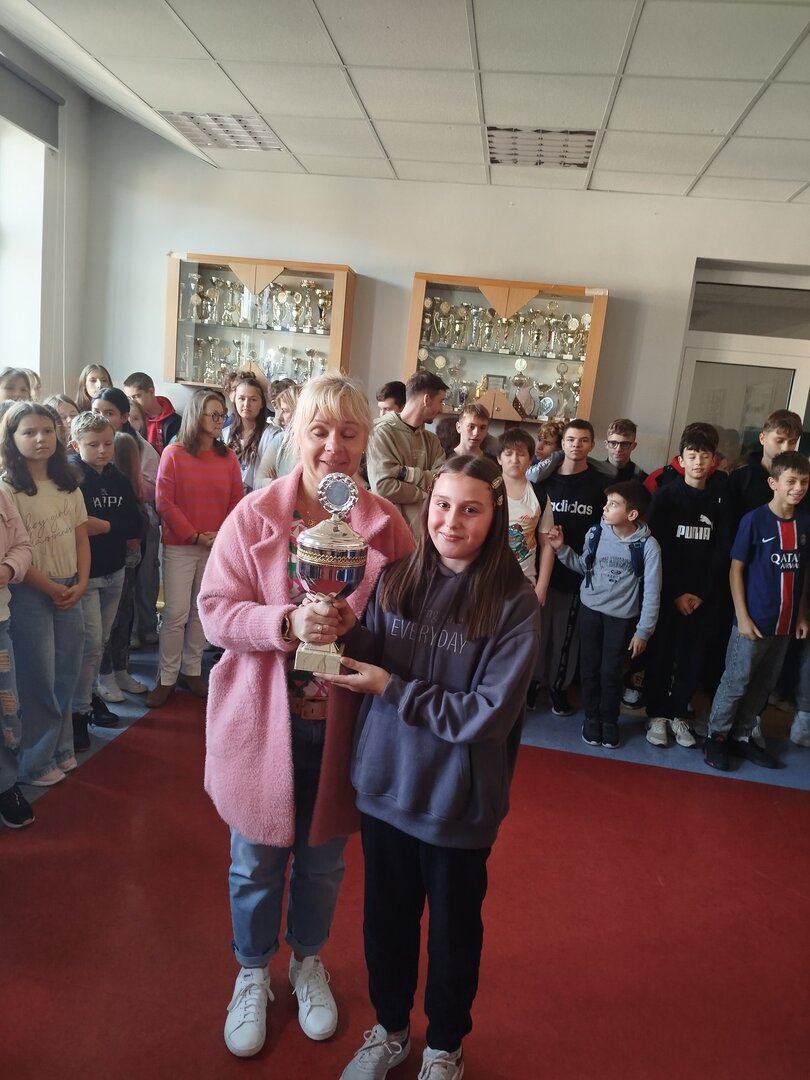 Edukacyjne trofeum przypadło uczniom zespołu 6b, a odebrała je od pani dyrektor, Renaty Gibes, w imieniu zwycięzców, Laura Górniak. Gratulujemy!