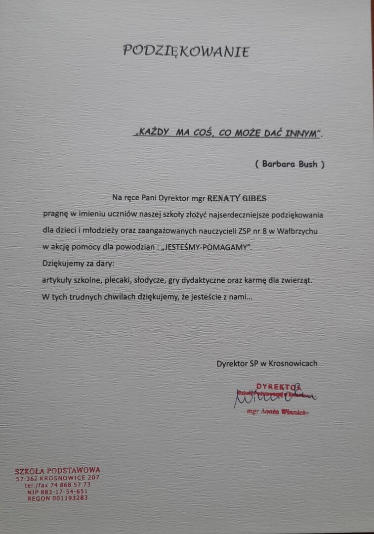 21 października 2024 roku grupa młodzieży naszej szkoły (uczniowie klas VIII a i b) wraz z Panią Dyrektor Renatą Gibes i nauczycielką religii - Panią Agnieszką Halicką zawiozła dary dla powodzian z Krosnowic.