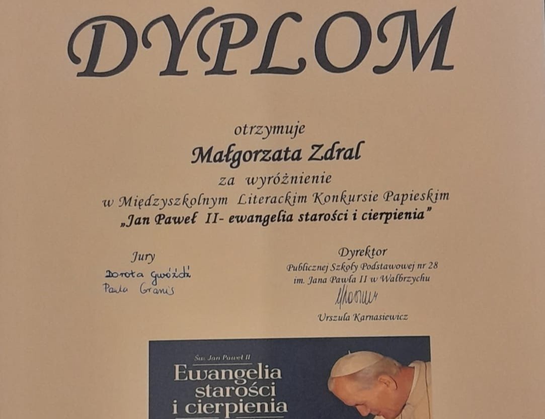W październiku uczniowie klas VI-VII wzięli udział w Międzyszkolnym Literackim Konkursie Papieskim -"Jan Paweł II - ewangelia starości i cierpienia". Organizatorzy konkursu - SP nr 28 w Wałbrzychu- otrzymali aż 37 prac literackich.