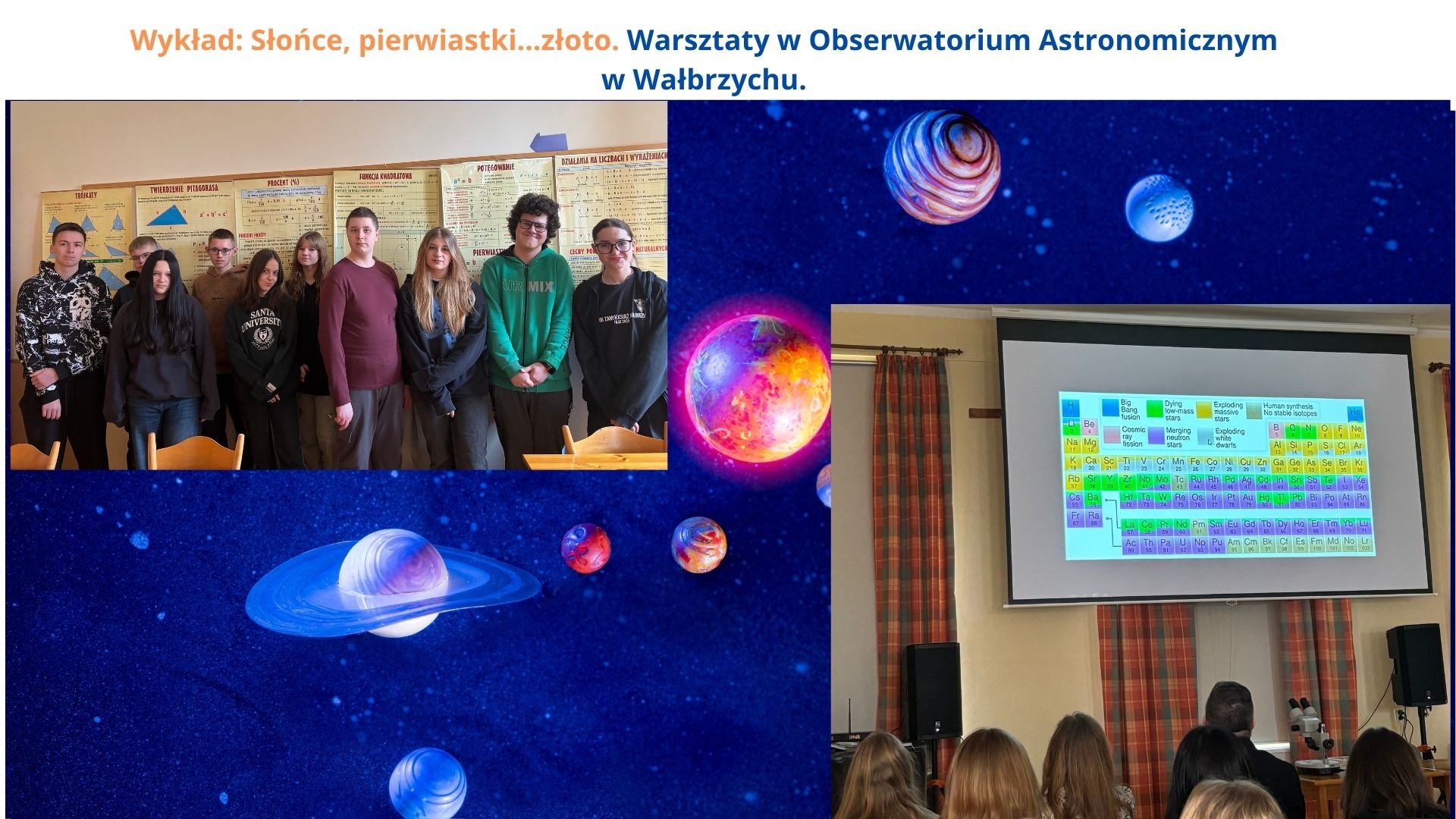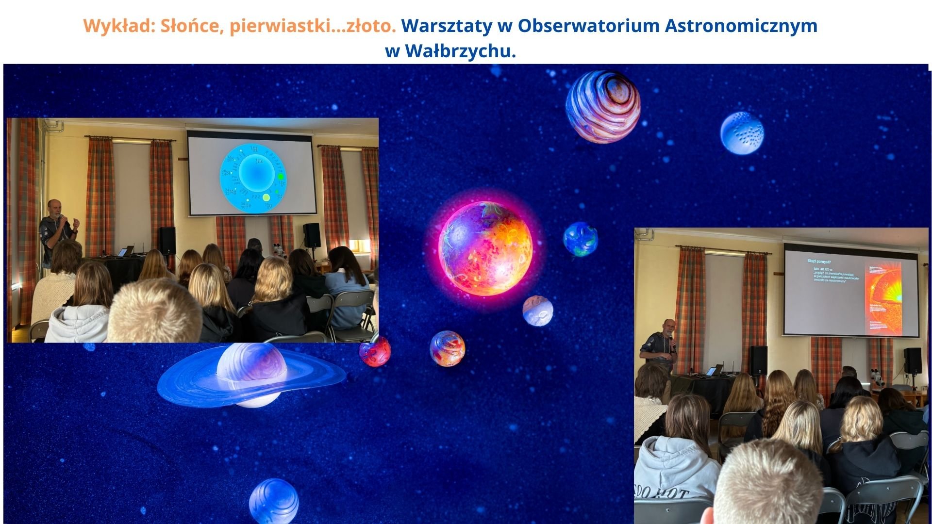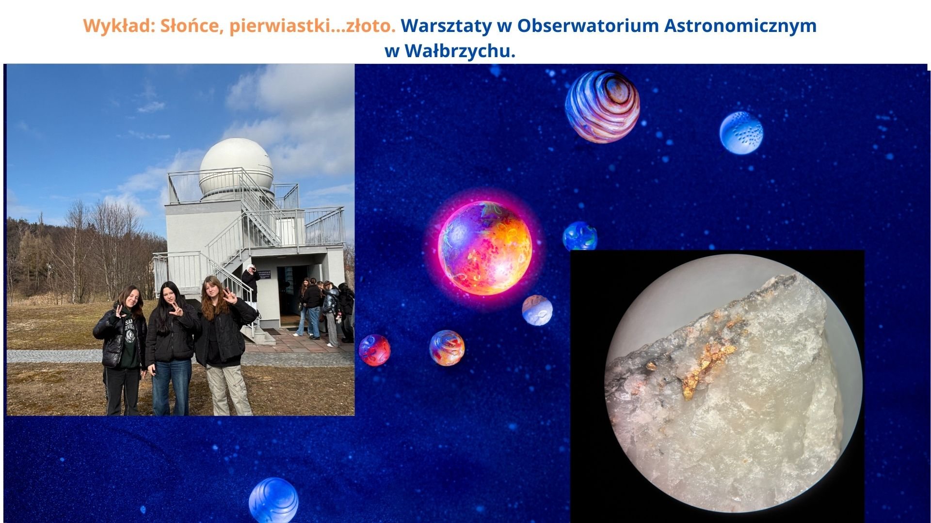 Uczniowie z klasy 8a wzięli udział w wykładzie pt: „ Słońce, pierwiastki… złoto” prowadzonym przez naukowców z Politechniki Wrocławskiej z Wydziału Geoinżynierii, Górnictwa i Geologii.