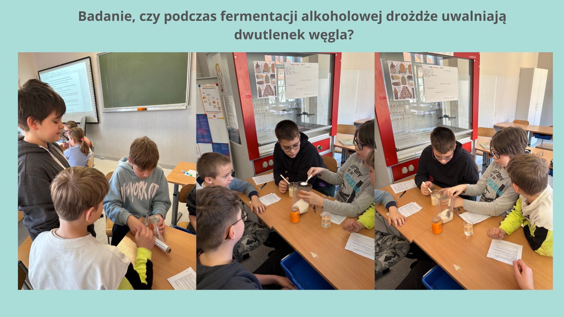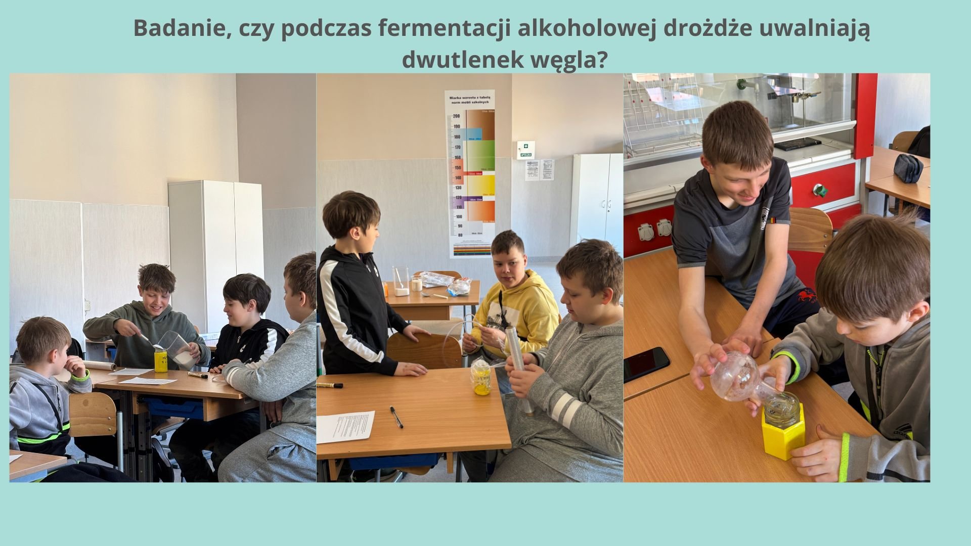Napełnili jeden słoik w jednej czwartej ciepłą wodą. Dodali do niego cukier. Zakryli słoik folią, po czym odczekali 15 minut. Do drugiego słoika wlali wodę wapienną, a następnie zakryli go folią. Połączyli słoiki gumową rurką.