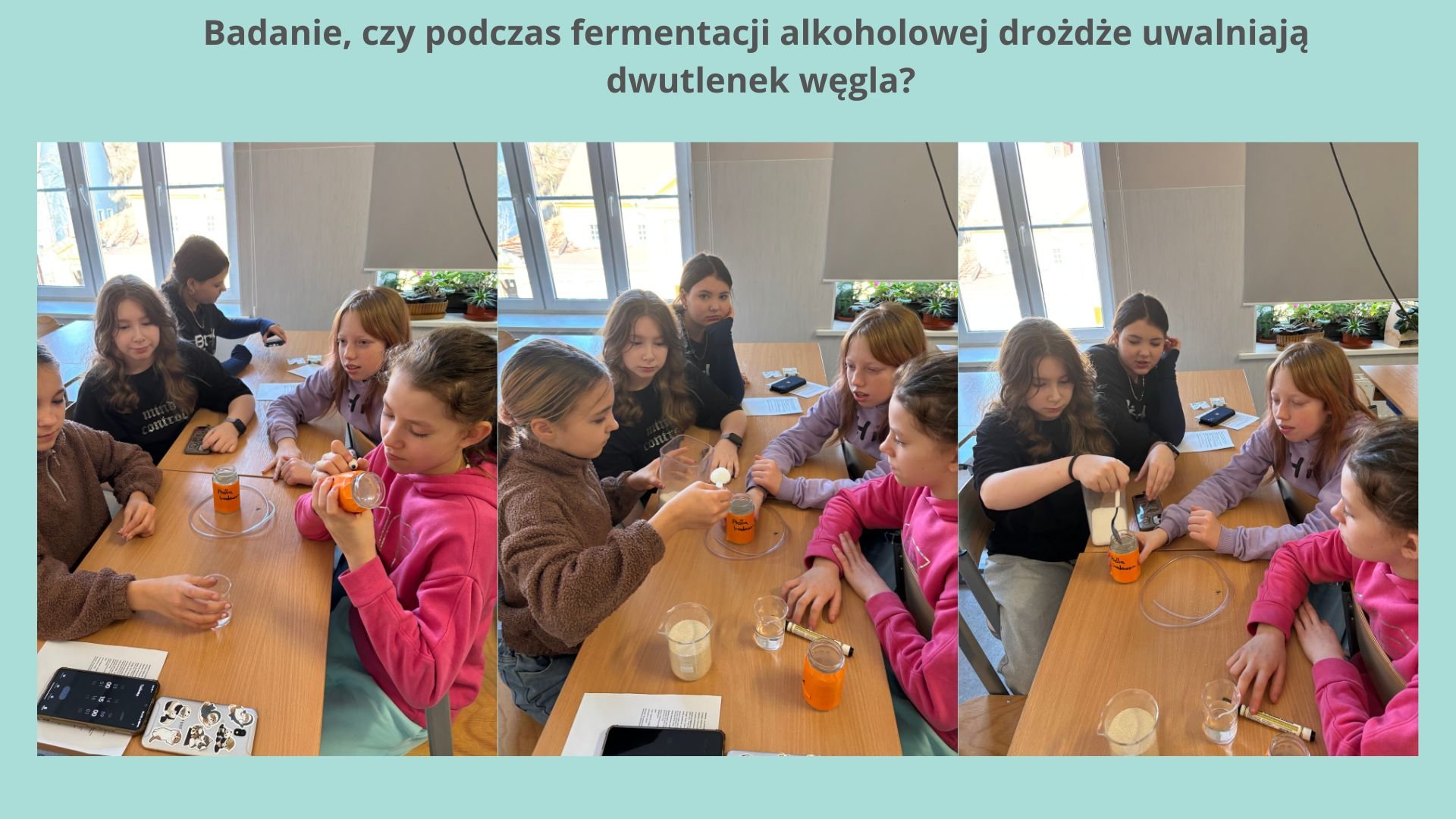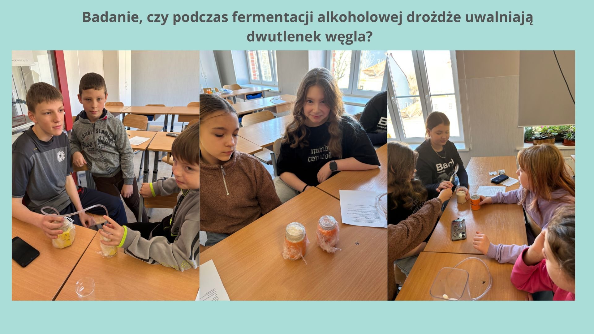 Przygotowali: cztery słoiki, folię spożywczą, dwie gumowe rurki, łyżkę suszonych drożdży, dwie łyżki cukru, wodę wapienna, ciepłą wodę z kranu.