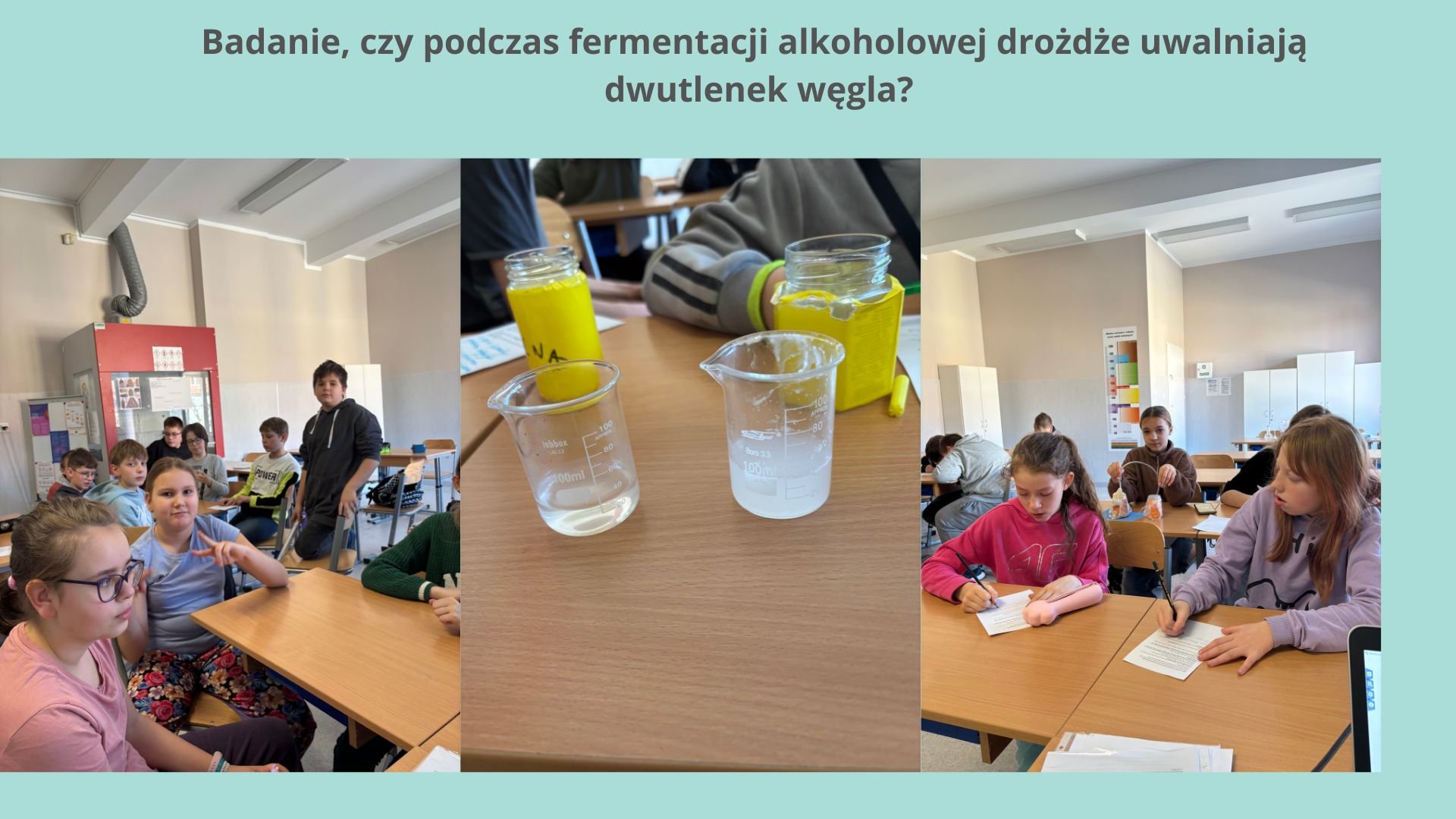 Uczniowie klas 5 na lekcji biologii przeprowadzili doświadczenie:Badanie, czy podczas fermentacji alkoholowej drożdże uwalniają dwutlenek węgla?