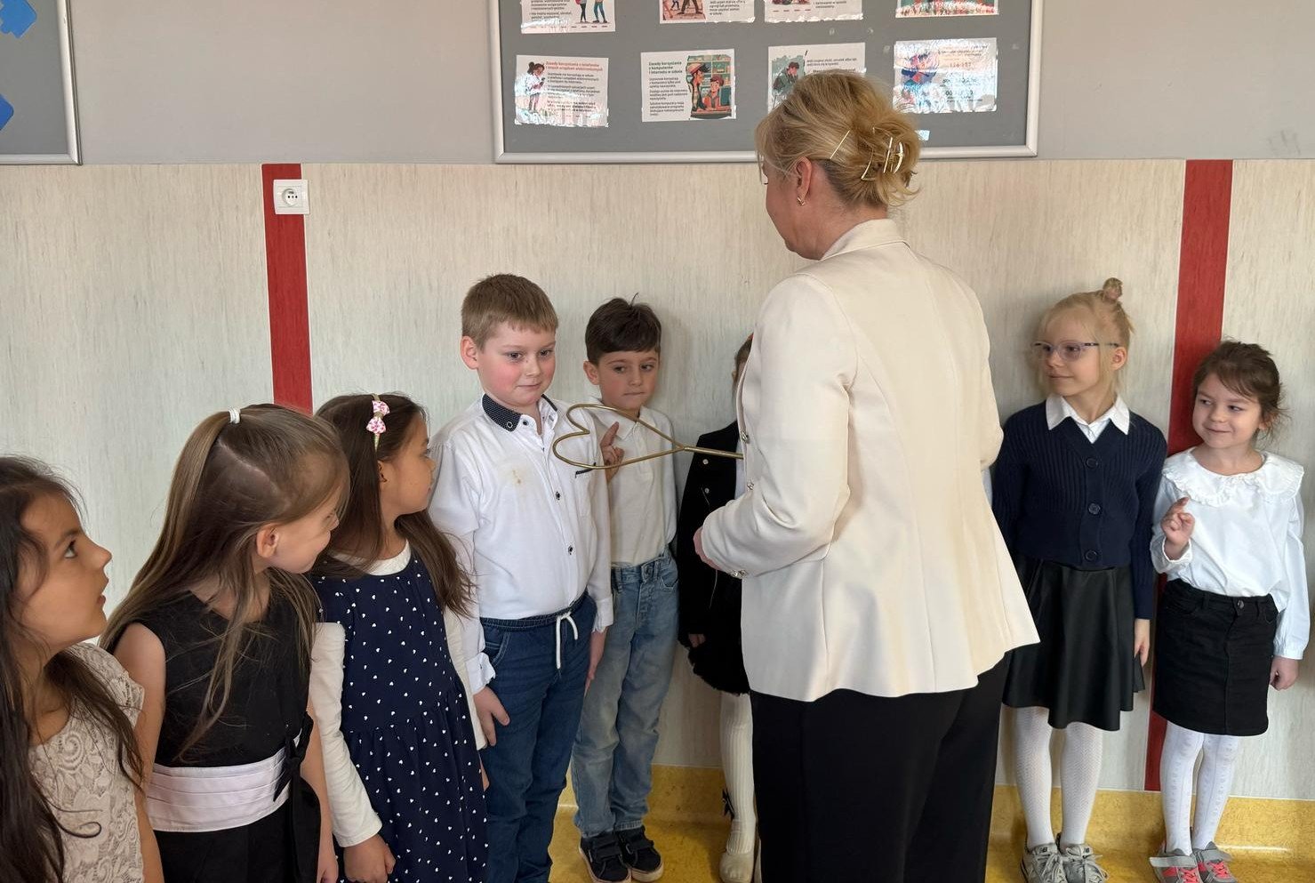 Następnie nadszedł najważniejszy moment – Pani Dyrektor, używając specjalnego Klucza do wiedzy i wyobraźni, pasowała każdego pierwszoklasistę na czytelnika. 📖🔑 Dzieci otrzymały książkowe upominki oraz piękne, ręcznie wykonane zakładki od starszych koleżanek i kolegów.